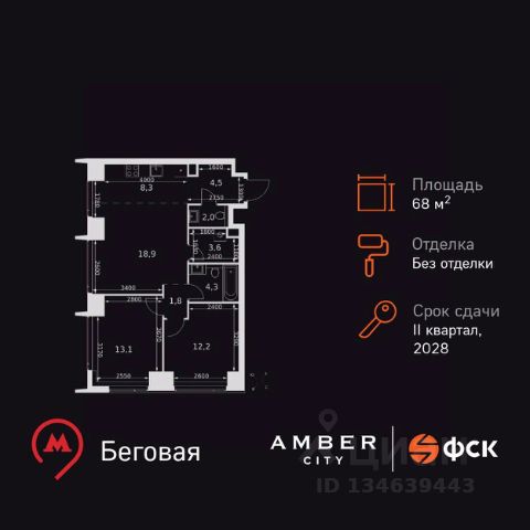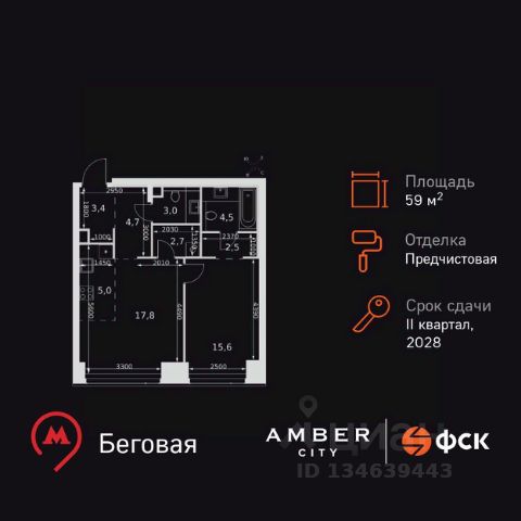 ИПОТЕКА 10% ДЛЯ ВСЕХ БЕЗ НАЦЕНОК! Прямая продажа от застройщика! Жилой Комплекс премиум-класса. Продаётся 2-к квартира номер 666 общей площадью 59.2 кв.м. на 4-м этаже 57 этажного здания. Отделка Whitebox. Цена с учётом скидки. Особенности квартиры: - Мастер-зона с санузлом и гардеробной. Всё для вашего комфорта и удобства, включая личный санузел и гардероб. - Просторная спальня, в которой можно разместить большую кровать. - Линейная планировка - максимальная функциональность и удобство. - Увеличенная ширина окна/окон - больше света и визуального простора. - Увеличенная высота окна - больше воздуха и света. - Гостевой санузел - комфорт и удобство для ваших гостей. - Постирочная - организуйте пространство для стирки и сушки вещей. - Евроформат - просторное и удобное жилье с отличной планировкой. - Гибкая планировка - создайте пространство по своему вкусу. - Место для игры/занятия спортом - идеальное пространство для активных детей. - Просторная мягкая зона - комфорт и уют для отдыха всей семьи. - Возможность добавить спальное место - дополнительный комфорт для гостей. - Проходная кухня-гостиная - идеальное пространство для общения и готовки. - Гардеробная - удобство для хранения и организации вещей. - Ниша под шкаф - компактное и удобное место для вещей. Квартира с предчистовой отделкой (White box). Вам не придется заниматься черновыми и трудоёмкими работы, а чистовую отделку и дизайн - сделайте на свой вкус. Информация о комплексе: Amber City - это не просто квартал. Это место, куда ведут все маршруты, где рождается вдохновение работать и творить, где счастлива семья и жизнь кипит 24/7. Модная архитектура, высокотехнологичные решения и самодостаточная инфраструктура приближают Amber City к лучшим районам Гонконга и Нью-Йорка. Потрясающие виды на Москва-Сити и центр позволяют заряжаться их амбициозностью, не подчиняясь суете. Стремящиеся ввысь небоскребы, благоустроенный парк с зонами отдыха для взрослых и детей, а также многочисленные объекты инфраструктуры возводятся в западной части центра Москвы. Транспортная доступность: Квартал отличается исключительной транспортной доступностью: большая часть значимых мест Москвы находится на расстоянии 15-20 минут. Такое расположение позволит полностью погрузиться в деловую и культурную жизнь столицы и тратить на дорогу только необходимый минимум времени. Общественный транспорт: - Станция метро "Беговая" - 5 минут пешком - Станция "Беговая" (МЦД-1) - 5 минут пешком - Ж/д станция Беговая - 12 минут пешком - Остановка "2-й Хорошёвский проезд" - 3 минуты пешком - Станция метро "Звенигородская" (строящаяся) - 10 минут пешком На автомобиле: - Звенигородское шоссе - 3 минуты - TTK - 5 минут - Хорошёвское шоссе - 9 минут - Садовое кольцо - 12 минут - Красная Пресня - 15 минут - Тверская - 20 минут - Серебряный бор - 8 минут - Строгинский затон - 8 минут - Москва-Сити - 10 минут - Кремль - 20 минут - Аэропорт Шереметьево - 40 минут Внутренняя инфраструкту