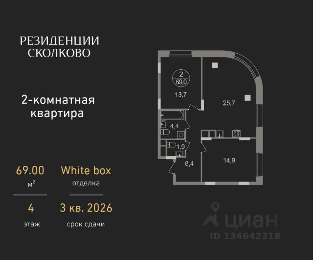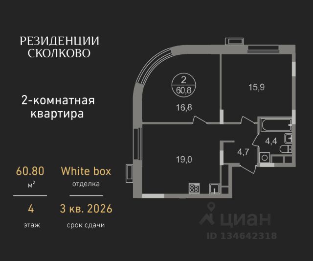 Продается двухкомнатная квартира в девятиэтажном монолитном доме жилого комплекса "Резиденции Сколково". Общая площадь квартиры - 60,8 кв. м, этаж 4 из 9. Срок сдачи - 3 квартал 2026 года. Квартира реализуется с одним из пяти видов отделки на выбор: - White-box - это возможность создать уникальный интерьер вашей квартиры, выбирая финальные отделочные материалы и мебель по вашему вкусу. - Лаконичный минимализм (Bussines либо Bussines Plus) - характеризуется мягкими натуральными цветами, высокой функциональностью, лаконичностью и комфортом. - Французская классика (Bussines либо Bussines Plus) - сдержанность цветовых решений и отсутствие броских деталей формируют чистое пространство, которое позволяет вам придать интерьеру индивидуальный стиль при помощи дополнительных элементов, ознакомиться с примером визуализации вы можете благодаря 3D туру в галерее. ЖК "Резиденции Сколково" - это современный проект бизнес-класса, расположенный в престижном районе Сколково, у западной границы Москвы. Транспортная доступность: - 0 км от МКАД - 10 минут на личном авто до метро "Озёрная" Солнцевской линии - 15 минут на личном авто до Москва-Сити по Кутузовскому проспекту - 20 минут на личном авто до центра по проспекту Генерала Дорохова - 24 минут на личном авто до центра по Мичуринскому проспекту Безопасность: Огороженная, закрытая территория, круглосуточное видеонаблюдение, контроль доступа во внутренний двор. Благоустройство и инфраструктура: Масштабное озеленение в концепции "двора-парка" и множество площадок отдыха для взрослых и детей. В 5 минутах ходьбы расположен Мещерский лесопарк. В жилом комплексе уже построены и работают 2 муниципальных детских сада с бассейном, планируется строительство 1 школы. В непосредственной близости - частные и муниципальные детские сады и школы, кафе и рестораны, продуктовые магазины, салоны красоты и другие готовые объекты городской инфраструктуры. Авторская архитектура: Авторская концепция архитектуры: панорамное остекление, французские балконы, стильные просторные лобби. Входные группы на уровне земли. Для удобства жителей на первых этажах предусмотрены помещения для колясок и на -1 этажах для хранения велосипедов.
