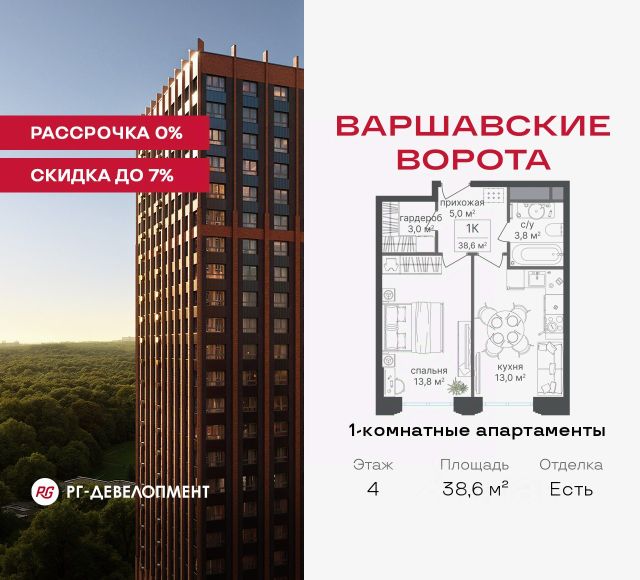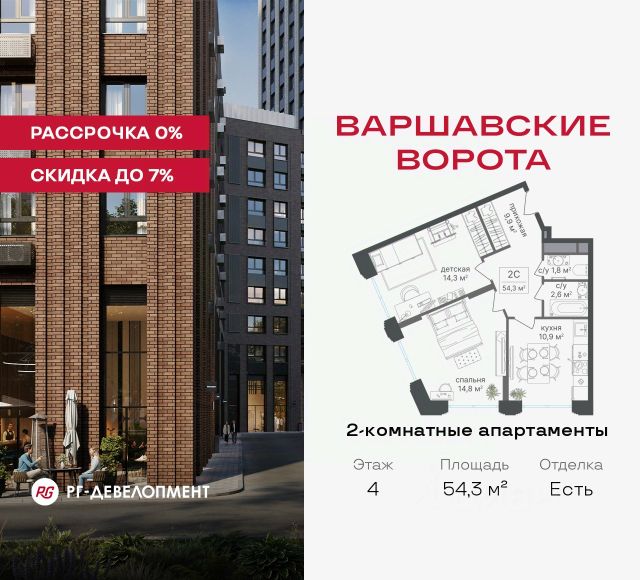Рассрочка 0% + скидка 5%. Первый платёж 50% при ДДУ, второй 50% — через 12 мес. до ввода ЖК. Продаются 2-комнатные апартаменты 54,3 кв.м. в МФК "Варшавские ворота" на 4-м этаже 9 этажного дома. МФК "Варшавские ворота" — это проект, в котором учтен широкий спектр требований: от транспортной доступности и развитой инфраструктуры до архитектурной выразительности и экологического окружения. Апартаменты в МФК "Варшавские ворота" подойдут для тех, кто ищет продуманное жилье в Москве или готовый инвестиционный актив. Апартаменты здесь — это: - возможность жить комфортно в удобном городском формате — с природой, метро, сервисом и паркингом; - возможность купить лот с готовой отделкой, чтобы вложить минимальные инвестиции в ремонт и получить максимум возможностей от сдачи; - экономия на налоге на имущество, кадастровая стоимость апартаментов ниже ~ на 30% кадастровой стоимости квартиры; - высокая инвестиционная доходность объекта за счет более низкой цены покупки по сравнению с квартирой. Коротко о важном: - 1 минута пешком от м. Аннино; - Удобные выезды на Варшавское шоссе и МКАД; - Вид из окон на Битцевский лес и Аннинский лесопарк; - Высота потолков 2,7 - 3 м; - Закрытый двор-парк; - Школы и детские сады в 10-15 минутах пешком от дома; - Технические лоджии для размещения кондиционеров; - Подземный паркинг; - РГ-Девелопмент — ТОП-20 крупнейших застройщиков России. Проект сочетает в себе современную архитектуру и продуманное благоустройство с уникальным природным окружением. Всего в нескольких минутах от дома — девять парков, каскад прудов и крупнейшие лесопарковые зоны Москвы, создающие ощущение жизни в зеленом оазисе посреди мегаполиса. Архитектурная концепция - стиль Чикаго в Москве. Выполнена в минималистичной эстетике с использованием клинкера и декоративного кирпича. Фасады подчеркивают строгие линии и современный стиль, а входные группы разработаны московским бюро Syntaxis. Лобби оформлены с применением керамогранита, декоративной штукатурки и гипсовых панелей, детали из латуни добавляют изысканности. Пространство оживляют гербарии, композиции из сухоцветов и авторские панно. Проект находится в одной минуте пешком от метро "Аннино", в 12 минутах от станции "Улица Академика Янгеля" и рядом с МЦД-2 "Красный Строитель". Для автомобилистов предусмотрен прямой выезд на Варшавское шоссе и два съезда на МКАД, что позволяет быстро добираться в любую часть города. Среди планировочных решений представлены разнообразные форматы: от функциональных студий до просторных 4-комнатных квартир и апартаментов площадью от 22 до 105 м². Высокие потолки усиливают ощущение простора, а продуманные планировки включают мастер-спальни, гардеробные, угловые окна, объединённые кухни-гостиные и несколько санузлов. Центральное пространство комплекса — закрытый двор без машин. Он разделён на функциональные зоны: детские игровые комплексы, спортивные площадки, воркаут-зоны и уютные места для тихого отдыха. На первых этажах разместя