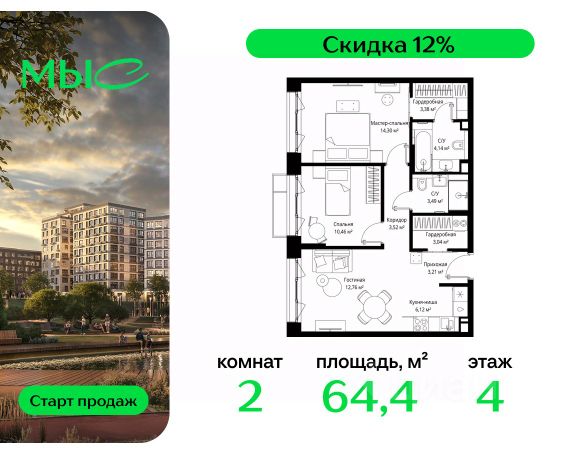 Прямая продажа от застройщика. Продаётся 2-комнатная квартира общей площадью 80.50 м² без отделки в премиальном жилом комплексе "МЫС" на 4-м этаже 12 этажного дома. Квартира расположена в корпусе "Волга". Проект МЫС — это, прежде всего, идеальное место для семей. В рамках проекта построят государственную школу, два детских сада и дворец спорта площадью 20 000 м2 с термальным комплексом, выплывным бассейном, фитнес-залом, теннисными, сквош и падел кортами и секциями для детей. На территории площадью, сравнимой с тремя парками Зарядье, появятся кафе и рестораны, пруд с набережной, спортивные и детские площадки, скейт-парк, лыжные и веломаршруты. Расположение: - 2 минуты до скоростной трассы М1 и Минского шоссе; - 10 минут до МКАД; - 15 минут до МЦД Лесной Городок - 20 минут до делового центра "Москва-Сити"; - 28 минут до аэропорта "Внуково". Благоустройство: - велосипедные и лыжные маршруты; - собственная набережная и парк; - лаунж-зоны в окружении природы; - беседки у очага; - дворец спорта площадью 20 000 м²; - термальный комплекс с тремя бассейнами; - 4 теннисных и падел-корта; - 6 сквош-кортов; - многофункциональный спортзал; - скейт-парк; - просторная площадь для прогулок с фонтаном; - детский Клуб с творческими секциями; - гастро-доминанта; - кафе у пруда, рестораны, ритейл. Окружение - соседство с лесным фондом; - школа на 1250 мест и 2 детских сада на 350 и 255 мест; - Дубковский и Подушкинский леса, парк "Рассказовка", Мещерский парк. Действуют специальные условия при 100% оплате, подробности уточняйте у менеджера в офисе продаж.