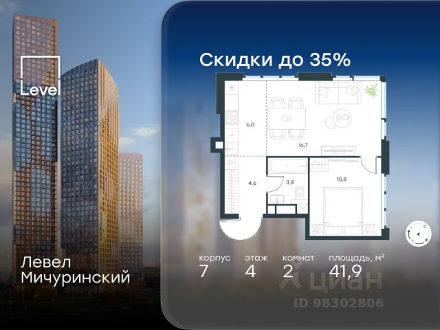 В продаже 1-к квартира от застройщика. Общая площадь 42.00, жилая 14.10, кухня 20.1. Квартира расположена на 4 этаже жилого квартала "Событие-6", корпус 1, Секция 3. Квартира с чистовой отделкой. Срок сдачи: 4 кв. 2029 года. СОБЫТИЕ.6 — финальный дом парк-квартала СОБЫТИЕ на Мосфильмовской. Переезжайте в уже сформированный квартал с готовой инфраструктурой и парком! Премиальный жилой комплекс в престижном районе Москвы предлагает стильную архитектуру, продуманное благоустройство и великолепно разнообразие общественных пространств. Свой парк прямо возле дома! Архитектура Архитектура СОБЫТИЯ.6 выполнена в ультрасовременном стиле московским бюро Atrium на основе дизайн-кода британских архитекторов LDA Design и UHA London. Дом отличает оригинальная геометрия фасадов, большое остекление и высокие лобби (до 6,2 м) с авторской мебелью и светильниками. Расположение Мосфильмовская улица (Раменки) — один из престижных районов Москвы. Близость к историческому и деловому центру, природным зонам Запада столицы. Транспортная доступность: • 10 мин до Москва-Сити и ТТК; • 15 мин до Садового кольца; • 25 мин до аэропорта Внуково; • 7-10 мин до станций метро "Аминьевская" и "Мичуринский проспект". Инфраструктура: • парк "Событие" (12 га, финалист конкурса Правительства Москвы) с беговыми (1,5 км) и велодорожками (2,7 км), экотропой (1,6 км), площадками, лекторием; • школа, детский сад, магазины, салоны красоты, рестораны (к моменту заселения); • мультидвор с игровыми и спортивными площадками, мини-бульваром; • общественная терраса на 10-м этаже (коворкинг, лаунж); • Закрытые общественные пространства: детская комната, спортивный зал, коворкинг, лаунж-зоны. Паркинг 256 мест для жителей (48 — для электромобилей), 24 гостевых (5 — для электромобилей), мойки колес, кладовые, зоны для велосипедов. Окружение Парки и заповедники (Воробьёвы горы, Матвеевский лес и др.), МГУ, театр им. Н. И. Сац, стадион "Лужники". Безопасность Видеонаблюдение, контроль доступа, видеодомофоны, консьерж-сервис 24/7, системы пожарной безопасности и мультисервисная оптическая сеть.