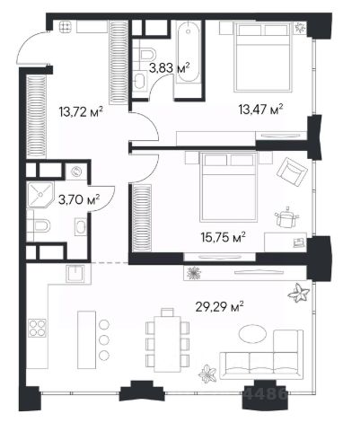 Масштаб: 92,6 м² общей площади с потолками 2,8 м и балконом, а 4 комнаты позволяют каждому найти свое пространство.