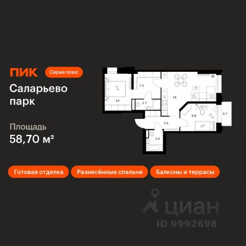 Продаётся 2-комн. квартира площадью 57,5 кв.м на 4 этаже 14 этажного дома (Корпус 57.5, Секция 5) проекта ПИК Саларьево парк. Светлый просторный подъезд на уровне земли, функциональная планировка, большие окна, предчистовая отделка. Жилой район "Саларьево парк" расположен в Новой Москве, в четырёх километрах от МКАД по Киевскому шоссе. Две станции метро: "Саларьево" и "Филатов луг", — находятся в пешей доступности от проекта. Дойти до них можно за 510 минут. В квартале уже создана качественная среда, где есть абсолютно всё для полноценной жизни, работы и отдыха. Благодаря удобному расположению проекта всё важное будет рядом: детские сады, школы, кафе и рестораны, шопинг в торговых центрах, фитнес и даже аэропорт. Все корпуса в квартале гармонично сочетаются, образуя единую городскую среду. Между собой их объединяет невысокая этажность и натуральная цветовая гамма. Здесь приятно гулять и проводить время на улице всей семьёй. В "Саларьево парке" создана уникальная образовательная среда, включающая в себя шесть школ, рассчитанных на 6 250 учеников. Две из них уже открыты, их посещает 2 300 детей. Также на территории "Саларьево парка" находится 12 детских садов, один из которых с бассейном. Сейчас уже открыты 7 садов. В "Саларьево парке" открыта уникальная игровая площадка — PlayHub "Оригами". Здесь есть ручей, горка-труба и рельефные холмы. Взрослые смогут отдохнуть в уютном кафе, пока дети играют. Также на территории проекта есть SportHub — большая спортивная зона, разделённая по интересам и возрастам. Здесь можно заниматься разными видами спорта: футболом, баскетболом, волейболом и стритболом. Зимой центральную часть площадки превращают в каток. Во дворах-парках жилого квартала есть места для отдыха, детские и спортивные площадки. На первых этажах домов расположены магазины, кафе и полезные сервисы. Также вблизи проекта есть несколько масштабных торговых центров. До ТЦ "Саларис" пять минут пешком, до "Рио", Metro Cash & Carry и "Леруа Мерлен" — пять минут на автомобиле. Артикул 1018712 (Застройщик ООО "Специализированный Застройщик "Тирон")