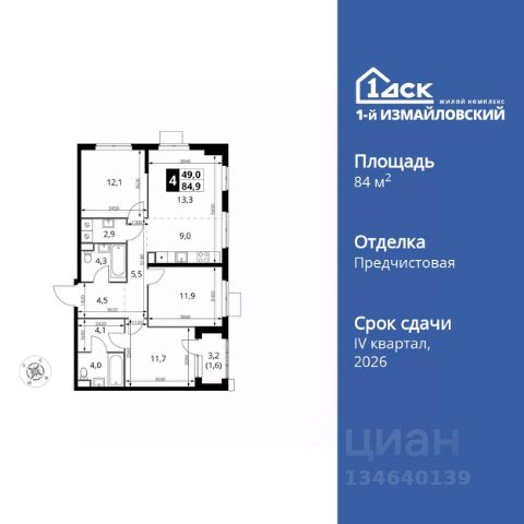 Прямая продажа от застройщика! Жилой Комплекс Комфорт класса. Продаётся 4-к квартира номер 571 общей площадью 84.9 кв.м. на 4-м этаже 15 этажного здания. Отделка Whitebox. Цена с учётом скидки. Особенности квартиры: - Мастер-зона с санузлом и гардеробной. Всё для вашего комфорта и удобства, включая личный санузел и гардероб. - Просторная спальня, в которой можно разместить большую кровать. - Угловая планировка - больше пространства для ваших идей. - Увеличенное количество окон - дополнительное освещение и свежий воздух. - Душ помимо ванной - дополнительное удобство для вашей семьи. - Постирочная с возможностью установки сушилки - удобство для ежедневных дел. - Евроформат - просторное и удобное жилье с отличной планировкой. - Гибкая планировка - создайте пространство по своему вкусу. - Место для игры/занятия спортом - идеальное пространство для активных детей. - Можно оборудовать 2 или более рабочих места - пространство для нескольких человек. - Можно оборудовать рабочее место - комфорт для работы и учёбы. - Просторная мягкая зона - комфорт и уют для отдыха всей семьи. - Кухня-гостиная - идеальное пространство для встреч с близкими. - Линейная кухня - функциональность и практичность в одном решении. - Наличие острова на кухне - удобство и стиль для вашей кухни. - Возможность добавить спальное место - дополнительный комфорт для гостей. - Гардеробная - удобство для хранения и организации вещей. - Хозяйственный блок - удобно организованное пространство для бытовых нужд. - Лоджия - уютное место для отдыха и тишины. - Панорамное остекление лоджии - открывает вид на окружающий мир. Квартира с предчистовой отделкой (White box). Вам не придется заниматься черновыми и трудоёмкими работы, а чистовую отделку и дизайн - сделайте на свой вкус. Информация о комплексе: Современный архитектурный проект "1-й Измайловский" - идеальное место для проживания, расположенное в восточной части Москвы в окружении 14 000 гектаров леса. Комплекс пронизан атмосферой здорового образа жизни и благополучия. Сиреневый сад и близлежащие лесопарки - это места, где можно насладиться лыжными прогулками зимой и тонизирующими пробежками летом. Расположенный между Щелковским шоссе и Амурской улицей, "1-й Измайловский" осмысляет себя не столько через близость к городским точкам притяжения, сколько через соседство с зелеными пространствами и спортивными объектами. Он отгорожен от шоссе застройкой первой линии и собственными садами здоровья. В его окнах - изумрудное море парка "Лосиный остров" и густые кроны окрестных дворов. В его графике - занятия спортом и прогулки в Измайлове. Транспортная доступность: Не более 2,5 км до станций метро "Щёлковская" и "Черкизовская" и МЦК "Локомотив". Щёлковское шоссе соединяет квартал с Северо-восточной хордой и МКАД, Центральным автовокзалом и Восточным железнодорожным вокзалом. Две автобусные остановки в паре минут ходьбы и 11 маршрутов общественного транспорта. На автомобиле 3 минуты до СВХ 12 минут до Т