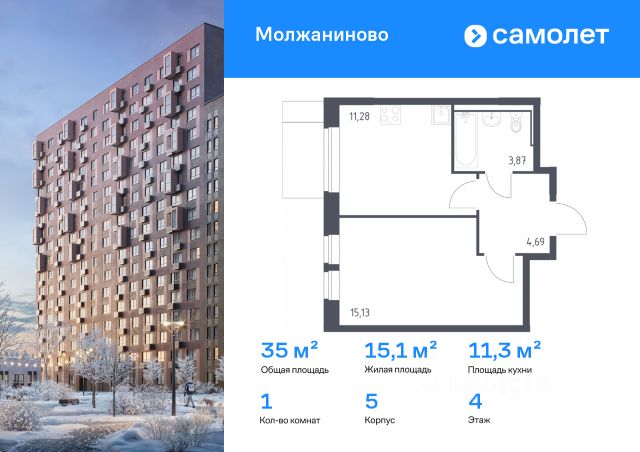 Строим кварталы для жизни с заботой о будущем. Предлагается 1-комнатная квартира комфорт-класса 34,97 кв.м в корпусе 5 на 4 этаже, в ЖК "Молжаниново" Квартира с чистовой отделкой. Доступность дополнительных опций уточняйте у застройщика. Приобрести квартиру возможно по специальным акциям от застройщика, с текущими условиями акций можно ознакомиться в блоке "Акций". Цена динамическая и может отличаться, уточняйте актуальность у застройщика. Жилой комплекс "Молжаниново" — это место, где каждый маршрут продуман так, чтобы вы проводили больше времени с близкими, а не в дороге. Ставьте паруса в канале имени Москвы, устраивайте пикники в Химкинском лесу или ищите редких птиц в Захарьинской пойме. Жилой комплекс сочетает в себе комфорт городской жизни с преимуществами природы. С одной стороны — московская регистрация, собственная инфраструктура, благоустроенные дворы с детскими площадками и зонами отдыха. С другой — ручей и пруд прямо на территории, а также много леса вокруг.