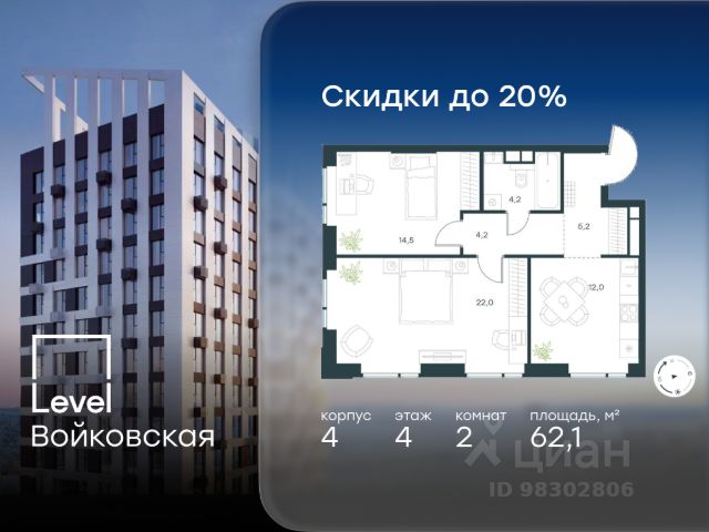 Цена указана с учётом скидки при 100%-й оплате, несубсидированной ипотеке, рассрочке (кроме программы "Рассрочка 0%"). Продается студия площадью 29.40 кв. м без отделки. Квартира находится на 4 этаже 20-этажного корпуса 5, в новом жилом комплексе бизнес-класса Level Войковская, расположенном рядом с живописным заповедником "Покровское-Стрешнево" (застройщик - компания Level Group/Левел групп). Прекрасная транспортная доступность - 7 мин. пешком до станции МЦК "Балтийская"; - 15 мин. пешком до станции метро "Войковская"; - 8 мин. на машине до ТТК; - 15 мин. на машине до центра Москвы; - 20 мин. на машине до Москва-Сити. Продуманный архитектурный проект - стильная архитектура от мастерской Фефелова В. В.; - панорамные виды на парки, Химкинское водохранилище и Останкинскую башню; - лобби с высотой потолков до 6,45 метров; - более 20 видов планировочных решений, включая редкие форматы квартир с террасой и увеличенной высотой потолков до 5,42 метров; - 2 варианта дизайнерской отделки в корпусе 4, предлагаются как дополнительная опция к отделке white box: стиль Modern в светлых холодных тонах и стиль Classic в нейтральной бежевой гамме. Квартиры в корпусах 3 и 5 сдаются без отделки. Расположение Level Войковская строится в престижном Северном округе Москвы. Развитая инфраструктура и живописная природа переплетаются в единый ансамбль, столь значимый для комфортной жизни. Войковский район окружают парки и набережные. В шаговой доступности - парк "Покровское-Стрешнево", не более 15-ти минут на велосипеде занимает путь до Тимирязевского парка и 9-ти минут до парка усадьбы Михалково. Рядом более 60 школ, 75 дошкольных учреждений, 17 государственных и 6 частных вузов, 25 супермаркетов, 4 торговых центра, среди которых ТЦ "Метрополис" и ТЦ "Авиапарк". Внутренняя инфраструктура На территории жилого комплекса предусмотрены коммерческие помещения: кафе, ресторан, пекарня и другие сервисы откроются на первых этажах корпусов. Для жителей будет доступен отапливаемый подземный паркинг на 244 машино-места с доступом с любого этажа на лифте. На территории паркинга будет расположено 125 кладовых помещений для хранения сезонного инвентаря. Лобби и благоустройство Дизайн лобби Level Войковская создан совместно с бюро BLANK. Это уютные гостиные, где хочется задержаться. Теплая цветовая гамма, ресепшен, зоны ожидания, лапомойки и гостевые санузлы - каждая деталь превращает лобби в комфортное продолжение вашего дома. 1,15 га площади в первых двух этапах строительства отведено под приватный внутренний двор, который спроектирован совместно с бюро "Правда". Детские площадки для всех возрастов, спортивные пространства для йоги, воркаута и петанка, уютные зоны для тихого отдыха или работы. Здесь утро начинается с вдохновения, а вечер наполнен приятными моментами. Лифты Комфортное перемещение внутри жилого комплекса будут обеспечивать надёжные лифты с доступом в паркинг с жилых этажей. В каждом корпусе предусмотрено по 3 грузопассажирских лифта.