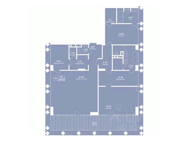 Мастер-спальня (33) с гардеробной (17), ванной (9,1) и выходом на балкон (7).