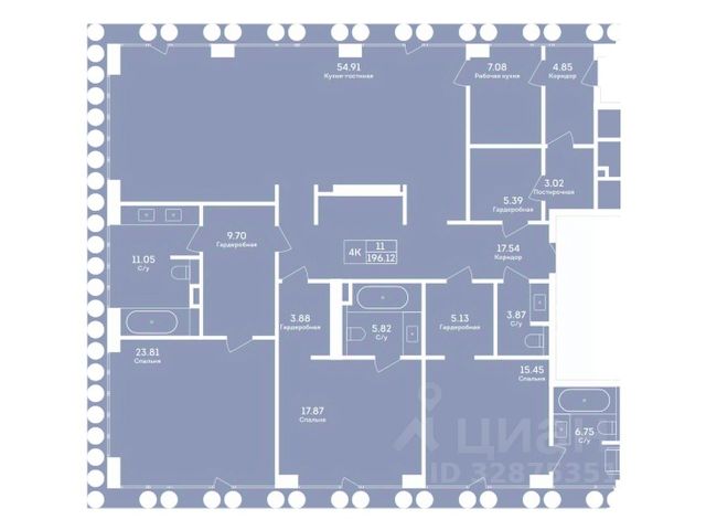 Прихожая (7), гостевой с/у (3,1), кухня (32,5), столовая (30,6), гостиная-столовая (32), коридоры (11,1 + 3 + 5,2), гардеробные (6,2 + 11,1).