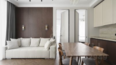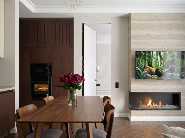 Кухонный гарнитур (6 м. Длиной) с крашенными фасадами. Техника Bosh (винный шкаф, духовка, микроволновка, два холодильника, посудомойка, стиральная и сушильная машины) система кондиционирования, водонагреватель, теплые полы по всей квартире, там где имеется керамогранит. Сантехника/инженерия Rehau, Электрика АВВ. Двери 2.30.