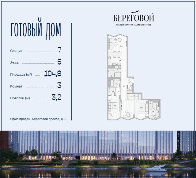 Река. Парк. Сити. Готовый дом в идеальном месте. Продается 3-комнатная квартира на 5 этаже с панорамным остеклением и видом на Береговой пр-д. Береговой — квартал-курорт в центре столицы. Готовый дом на первой линии Москвы-реки. Пешеходная набережная начинается прямо от дома — никаких дорог между вами и рекой. Уникальное сочетание природы парка Фили и ритма Сити. Ключи от нового образа жизни в Береговом: • 12 террас на крышах — ваши виды на Москву с высоты птичьего полета • Пешеходная набережная прямо у дома — ни одной машины между вами и рекой • Лобби с камином, переговорной и консьерж-сервисом • Флагманский Encore Fitness — самый большой в сети (4700 м²) с бассейном, термами и спа-комплексом • Детство на берегу Москвы-реки — в рамках проекта будут построены две школы и детский сад рядом с домом • Гастрономическая набережная: рестораны и премиум-сервисы откроются на первых этажах • Причал "Береговой" рядом с домом — путешествуйте по городу, пока другие стоят в пробках • Безопасность и уединение: контроль доступа на территорию, видеонаблюдение и круглосуточная диспетчерская • Двухуровневый подземный паркинг и кладовые Безупречная квартира для жизни: • Пространство света и воздуха: панорамные окна и высокие потолки 3.2 м • Технологии: центральное кондиционирование и роботизированная система очистки фасадов — вид из окна всегда будет идеальным • Совершенство планировки: просторная кухня-гостиная, минимум коридоров, максимум полезной площади • Квартира без отделки — возможность раскрыть преимущества планировки в вашем уникальном интерьере. Или выбирайте свою версию идеального дома в коллекции планировок: • С изолированными спальнями • Мастер-спальнями с гардеробными и ванными • Видовые ванные комнаты • Функциональные постирочные Эксклюзивные лоты: • Пентахусы с приватными террасами • Двухуровневые пентхаусы Локация, о которой мечтают 15 минут до Сити на машине — и вы в эпицентре деловой жизни. Две станции метро в пешей доступности — когда каждая минута на счету. Утром — пробежка по парку Фили, вечером — прогулка на велосипеде вдоль реки, выходные — водный спорт в Крылатском. Речные трамвайчики вместо такси, зеленые парки и благоприятная экология — привилегии престижного ЗАО Москвы. Условия покупки: выгодные программы покупки от застройщика, специальные условия при полной оплате. Оставляйте заявку на персональную презентацию в шоу-руме.