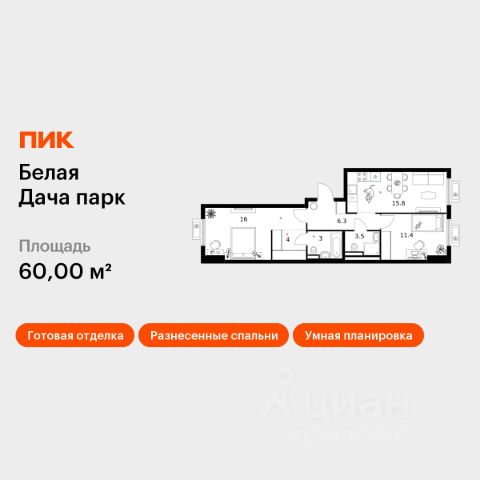 Продаётся 2-комн. квартира площадью 69 кв.м на 5 этаже 20 этажного дома (Корпус 16.2, Секция 7) проекта ПИК Белая Дача парк. Светлый просторный подъезд на уровне земли, функциональная планировка, большие окна, c отделкой. "Белая Дача парк" — новый проект в Московской области, в городе Котельники. Квартал расположен в 2 километрах от МКАД и в 7 минутах на автомобиле от метро "Котельники". Уже сейчас вы можете приобрести квартиры с отделкой в готовых и строящихся корпусах. На территории квартала будут построены 22 дома, две школы, поликлиники и пять детских садов. Один из центральных элементов проекта — широкий пешеходный бульвар, где мы создали пространства для спорта, прогулок и отдыха. Яркой точкой притяжения стал PlayHub "Ферма" — масштабная игровая зона с домом-мельницей, искусственным ручьём и развивающими элементами для детей. В 2024 году PlayHub стал победителем "Всероссийской премии лучших проектов создания игровой среды" и получил награду "Лучшая реализация игровой площадки среди девелоперских проектов". Рядом с кварталом много магазинов и развлекательных центров: "Outlet Village Белая дача", "МЕГА Белая дача", гипермаркет "Глобус", центр оптовой торговли Selgros. До Люберецких карьеров можно добраться на машине за 9 минут, а до парка "Кузьминки" — за полчаса. Артикул 1008889 (Застройщик АО "СЗ "Новый Горизонт")