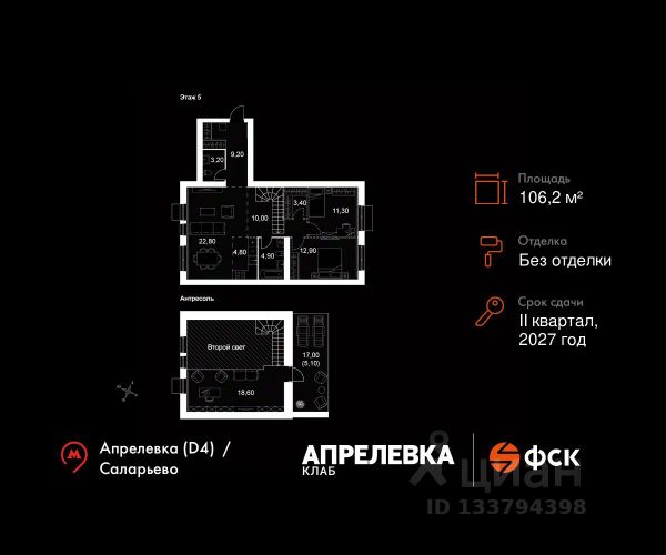 Прямая продажа от застройщика! Загородный жилой комплекс класса Комфорт Плюс. Продаётся 2-к квартира 105 общей площадью 43.1 кв.м на 5-м этаже 5 этажного дома. Без отделки. Расположение комплекса: "Апрелевка Клаб" это жилой комплекс всего в 30 км от Москвы по Киевскому шоссе, где городские удобства гармонично сочетаются с природой. Здесь начинается новая ступень жизни: современная малоэтажная застройка не нарушает живописные виды, а закрытая территория дарит чувство безопасности. Особенности проекта: - Улучшенная отделка МОПов - Социальная инфраструктура в шаговой доступности: муниципальные детский сад и школа, поликлиника - Не просто школа: школа МГИМО - Школа искусств МАРХИ - Всесезонное уникальное благоустройство: от города к природе через призму искусства - Комфортное пространство (спорт, досуг с детьми, работа в удаленном формате с прекрасными видами, место для творчества, тихие места для уединения и размышления) - Отличная транспортная доступность Транспортная доступность: - Метро Филатов Луг и Рассказовка 25 км - МЦД Апрелевка 5 км - МКАД — 30 км - Садовое кольцо — 45 км - Метро в Троицке (открытие в 2030) — 22 км - Ближайшая остановка общ. транспорта "Фрунзевец" 550 м - Ст. м. "Саларьево" 30 мин. на автобусе Внутренняя инфраструктура: Здесь есть хобби на любой вкус, возраст и сезон. Велосипедные, беговые и прогулочные маршруты, уличный workout, летний амфитеатр, спортивная площадка, центральная площадь с сухим фонтаном и игровыми зонами. Крытые развлечения: зона коворкинга, детская комната, кафе. В жилом комплексе будет современная школа на 830 мест и детский сад на 400 мест нового формата: с просторными классами и современным оснащением согласно высоким стандартам. Также на территории будет размещена школа искусств. Дворы без машин, игровые зоны и маршруты для прогулок с навигацией минимизируют риски и создают ощущение защищенности. Вдоль южной границы комплекса протекает река Десна, создавая зону отдыха в природном окружении.