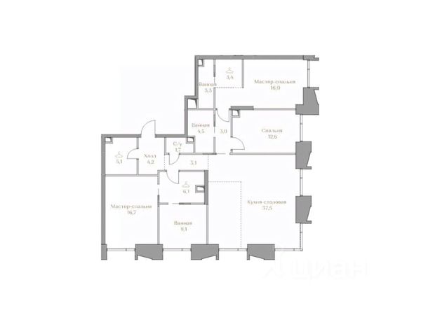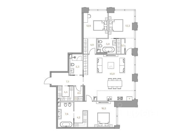 Просторная квартира с тремя мастер-спальнями. Панорамные окна наполнят квартиру светом, а уникальной её особенностью станет огромный полукруглый балкон, выйти на который можно из всех помещений.