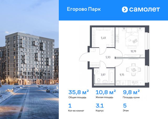 Квартира расположена на 5 этаже 17-этажного монолитного дома, построенного в 2014 году. Общая площадь составляет 64,4 кв. м, из которых 34 кв. м — жилая площадь, а 14 кв. м — кухня. Высота потолков в 2,7 м создаёт ощущение простора и свободы.