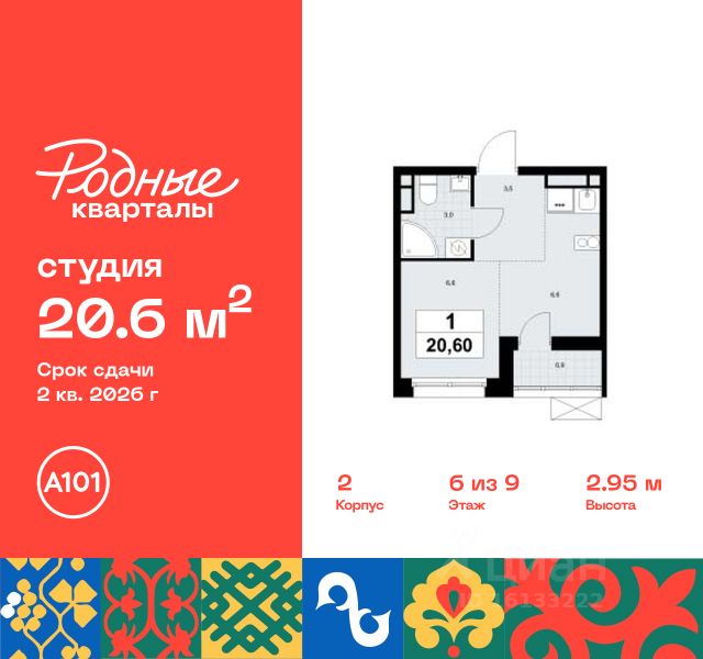 Продается студия 80 в новостройке Жилой район "Родные кварталы" по адресу Москва, ТиНАО, Новомосковский АО, Марушкинское С/П, жилой комплекс Родные Кварталы, 2, район Внуково, Новомосковский административный округ, Москва. Общая площадь квартиры - 20.60 кв. м., этаж 6 из 9, секция 2. Тип проекта, по которому построен дом - монолит, компания-застройщик - ООО "А101". Стоимость квартиры - 8458360 Р. Срок сдачи - 2 квартал 2026. ПРЕДЛОЖЕНИЯ ОТ ЗАСТРОЙЩИКА В ФЕВРАЛЕ 2026: Скидки до 10% на все квартиры. Только в офисах продаж до 28 февраля. Ипотека от 13,9 % для всех! На весь срок. "Семейная ипотека" вернулась. Ставка от 3,5 % на весь срок! Без удорожания! Выгодное ипотечное комбо: Ипотека от 2200 р./мес. и от 6 % после рождения ребёнка! Ипотека для всех "Держи пять!" - ставка 5 % на 2 года! *более подробную информацию по скидкам и акциям уточняйте в отделе продаж ЖК "Родные кварталы" строится в экологически благоприятной локации, рядом с парком Изварино и Ульяновским лесопарком. До станции метро "Аэропорт Внуково" и МЦД "Толстопальцево" - 15 мин. на транспорте. До Боровского, Киевского, Минского шоссе - 3, 6 и 20 минут соответственно Основная концепция благоустройства - воссоздание колорита разных регионов России. Этот же принцип использован в благоустройстве и озеленении района от бюро GAFA. Лесопарк, зоны отдыха, пешеходный бульвар со спуском в виде амфитеатра к набережной и центральной торговой площади, спортивные площадки. В шаговой доступности откроются детские сады и школа, поликлиника. На первых этажах домов - спортклубы, клиники, аптеки, супермаркеты, кафе и многое другое. Цветовые решения лобби также созвучны климатическим зонам России. Здесь появятся зоны ожидания с гостевыми санузлами и колясочными. Предусмотрены подземные паркинги и кладовые. Преимущества "Родных кварталов" - уютная атмосфера "малой родины" - полноценная инфраструктура внутри района - выезд на ключевые шоссе - от 3 минут на автомобиле - малоэтажная застройка