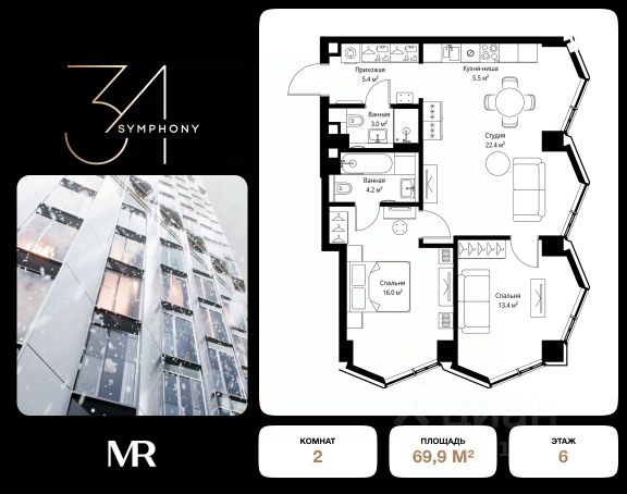 Дом сдан. Ключи в день покупки! В продаже 2-комнатная квартира площадью 61.20 м² с чистовой отделкой на 6 этаже 36 этажного дома в корпусе Сиена. ЖК Симфония 34 - концептуально новый жилой комплекс премиум-класса с подземной парковкой, состоит из четырех башен высотой 36 - 54 этажа. Квартиры сдаются с дизайнерской чистовой отделкой MR READY с встроенными кухнями и премиальной техникой. Приобретение квартиры с чистовой отделкой позволяет избежать лишних хлопот, ведь включает в себя установку мебели и бытовой техники на кухне, что является дополнительным бонусом. Высота потолков 3 - 6 метров, окна высотой до 2,6 м. Более 100 кладовых в подземной части ЖК и более 500 на этажах. Безопасность - Система контроля входа на территорию комплекса, биометрия - Система автоматического водяного пожаротушения и противопожарного водопровода, система пожарной вентиляции - Доступ на парковку при помощи системы распознавания автомобильных номеров, карточка для контроля доступа резидентов - Система видеонаблюдения - Круглосуточная связь через приложение, телефон, голосовые сообщения с охраной, консьержем, call-центр Расположение Пешком - 6 минут до метро "Дмитровская" - 15 минут до Тимирязевского парка На машине - 5 минут до Савеловского вокзала и Аэроэкспресса в Шереметьево - 10 минут до Москва-Сити и Садового кольца Благоустройство - 70% территории отведены под зеленые насаждения и ландшафтный дизайн - Приватный Японский сад - Детские площадки с зонированием по возрасту - Clubhouse для резидентов - Wellness & SPA - Зона для пикника, зона с гамаками - Центральное лобби, ресторан, коммерческие помещения - Дополнительный вход/выход на территорию комплекса Окружение - В 10 минутах от Symphony 34 находится дизайн-завод Flacon, где регулярно проходят культурно-образовательные и развлекательные мероприятия - Тимирязевский парк расположен в 850 м. Площадь парка 232 га - Рядом расположен парк "Дубки", площадью 16,5 га - В 15 минутах расположен Хлебозавод 9. Здесь находятся шоурумы брендов, кафе разных кухонь мира, образовательные проекты и площадки для мероприятийКомпания MR предлагает своим клиентам специальные условия приобретения квартир в рамках программ ипотечного кредитования от банков-партнеров.
