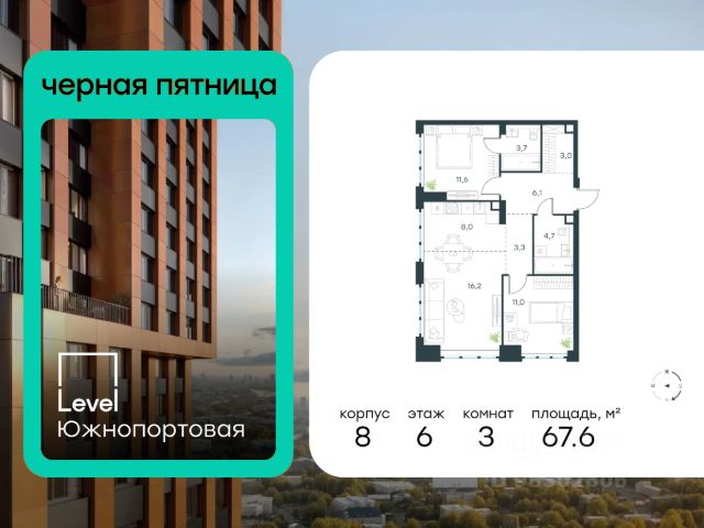 Цена указана с учётом скидки при 100%-й оплате, несубсидированной ипотеке, рассрочке (кроме программы "Рассрочка 0%"). Субсидированная семейная ипотека. Полная стоимость кредита 20,963 - 23,237% годовых. Ставка 3,9% годовых. Первоначальный взнос от 20,01%. Сумма кредита до 12 млн. руб. В северной части района Печатники продается 3-комнатная квартира площадью 67.60 кв.м без отделки. Квартира расположена на 6 этаже 49-этажного корпуса Корпус 8 в жилом комплексе комфорт-класса Level Южнопортовая (компания Level Group/Левел групп). Отличная транспортная доступность: - 10 мин. пешком до станции метро "Кожуховская"; - 20 мин. пешком до станции МЦК "Дубровка"; - 3 мин. на авто до ТТК; - 13 мин. на авто до Садового кольца; - 15 мин. на авто до Бульварного кольца. Продуманный архитектурный проект: - авторская архитектура от бюро СПИЧ; - уникальные виды на реку, парки и достопримечательности города; - высота потолков в квартирах до 6 м; - окна высотой до 1,87 м с высоким коэффициентом сопротивления теплоотдаче. Расположение: Level Южнопортовая строится в северной части района Печатники - самой приближенной к центру. Здесь будет сформирован новый район "Южный порт", где построят крупный жилой и общественно-деловой центр, аналогичный Москва-Сити. В течение 10-12 лет в этом месте появятся не только жилые дома, но и развитая инфраструктура для жизни и работы. А еще совсем рядом находится набережная Москвы-реки, где планируется построить причалы для речных трамвайчиков и канатную дорогу. Уже сейчас вокруг жилого комплекса работают десятки магазинов и торговых центров, рядом расположено 6 парков, среди которых музей-заповедник "Коломенское". В 10 минутах пешком - 2 муниципальных и 2 частных детских сада, 7 общеобразовательных школ. Внутренняя инфраструктура: Для отдыха жителей в каждом корпусе предусмотрено лобби, оснащенное местами для отдыха, гостевыми санузлами и лапомойками, а в отдельных корпусах - камином. За счёт больших окон и высоких потолков пространства будут наполнены воздухом и светом. На первых этажах жилого комплекса откроются кафе, магазины, салоны красоты, фитнес-центр. Для детей строятся собственные детский сад и школа. Благоустройство: Внутренний двор комплекса разработан совместно с бюро GAFA. Основная идея - создать аналог Центрального парка в Нью-Йорке, гармонично сочетая высотные здания и большое изолированное парковое пространство. Вся площадь двора-парка будет огорожена и составит более 2 га, из которых 45% - озеленение. Одним из самых важных ландшафтных элементов здесь станет небольшая речка, наполняющаяся во время дождя. Вокруг неё появится сеть из островов, внутри которых расположатся тематические зоны спорта и отдыха. Технологии и инженерия: - автоматическая передача в управляющую компанию показаний квартирных счётчиков; - телефонная связь, телевидение и интернет на базе оптической мультисервисной сети; - гостевой Wi-Fi в лобби и на территории двора; - единый ключ доступа для входа на территорию комплекса.