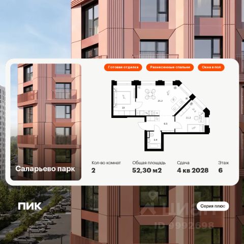 Продаётся 2-комн. квартира площадью 50,3 кв.м на 6 этаже 16 этажного дома (Корпус 20, Секция 2) проекта ПИК Саларьево парк. Светлый просторный подъезд на уровне земли, функциональная планировка, большие окна, c отделкой. Жилой район "Саларьево парк" расположен в Новой Москве, в четырёх километрах от МКАД по Киевскому шоссе. Две станции метро: "Саларьево" и "Филатов луг", — находятся в пешей доступности от проекта. Дойти до них можно за 510 минут. В квартале уже создана качественная среда, где есть абсолютно всё для полноценной жизни, работы и отдыха. Благодаря удобному расположению проекта всё важное будет рядом: детские сады, школы, кафе и рестораны, шопинг в торговых центрах, фитнес и даже аэропорт. Все корпуса в квартале гармонично сочетаются, образуя единую городскую среду. Между собой их объединяет невысокая этажность и натуральная цветовая гамма. Здесь приятно гулять и проводить время на улице всей семьёй. В "Саларьево парке" создана уникальная образовательная среда, включающая в себя шесть школ, рассчитанных на 6 250 учеников. Две из них уже открыты, их посещает 2 300 детей. Также на территории "Саларьево парка" находится 12 детских садов, один из которых с бассейном. Сейчас уже открыты 7 садов. В "Саларьево парке" открыта уникальная игровая площадка — PlayHub "Оригами". Здесь есть ручей, горка-труба и рельефные холмы. Взрослые смогут отдохнуть в уютном кафе, пока дети играют. Также на территории проекта есть SportHub — большая спортивная зона, разделённая по интересам и возрастам. Здесь можно заниматься разными видами спорта: футболом, баскетболом, волейболом и стритболом. Зимой центральную часть площадки превращают в каток. Во дворах-парках жилого квартала есть места для отдыха, детские и спортивные площадки. На первых этажах домов расположены магазины, кафе и полезные сервисы. Также вблизи проекта есть несколько масштабных торговых центров. До ТЦ "Саларис" пять минут пешком, до "Рио", Metro Cash & Carry и "Леруа Мерлен" — пять минут на автомобиле. Артикул 946878 (Застройщик ООО "Специализированный Застройщик "Тирон")