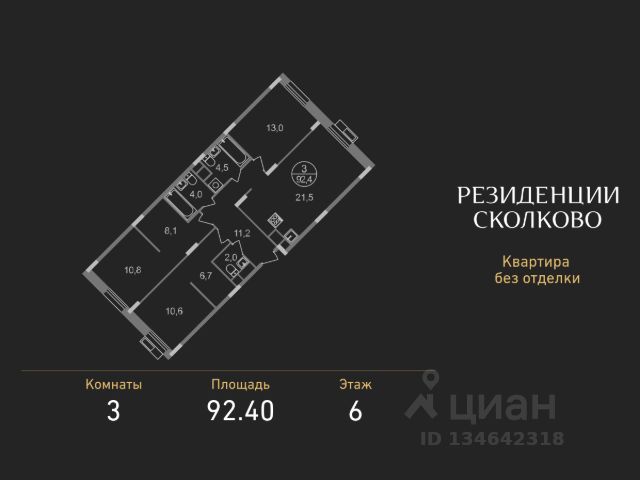 Продается двухкомнатная квартира без отделки в девятиэтажном монолитном доме жилого комплекса "Резиденции Сколково". Общая площадь квартиры - 68,6 кв. м, этаж 6 из 9. Срок сдачи - 2 квартал 2027 года. ТОЛЬКО ДО 30 АПРЕЛЯ выгодные условия на приобретение квартиры в ипотеку или рассрочку. Звоните - и мы подберем оптимальное предложение под ваш запрос! Резиденция 2.1 состоит из 5 секций: - 1 и 5 секции с отделкой White Box с возможностью повышения до дизайнерской за дополнительную плату - Остальные секции - без отделки ЖК "Резиденции Сколково" - это современный проект бизнес-класса, расположенный в престижном районе Сколково, у западной границы Москвы. ТРАНСПОРТНАЯ ДОСТУПНОСТЬ: - 0 км от МКАД - 10 минут на личном авто до метро "Озёрная" Солнцевской линии - 15 минут на личном авто до Москва-Сити по Кутузовскому проспекту - 20 минут на личном авто до центра по проспекту Генерала Дорохова - 24 минут на личном авто до центра по Мичуринскому проспекту ОСОБЕННОСТИ РЕЗИДЕНЦИИ 2.1: - панорамное остекление - французские балконы - сквозные входные группы с безбарьерным входом - стильная мягкая зона ожидания - колясочные во входных группах на 1 этажах - входная группа 1 этажа каждой секции оснащена санузлом - паркинг на -1 этажах - по 2 лифта: 1 пассажирский, 1 грузопассажирский ПРИВАТНОСТЬ: Огороженная, закрытая территория, круглосуточное видеонаблюдение, контроль доступа во внутренний двор. БЛАГОУСТРОЙСТВО И ИНФРАСТРУКТУРА: Масштабное озеленение в концепции "двора-парка" и множество площадок отдыха для взрослых и детей. В 5 минутах ходьбы расположен Мещерский лесопарк. В жилом комплексе уже построены и работают 2 муниципальных детских сада с бассейном, школа на этапе строительства. В непосредственной близости - частные и муниципальные детские сады и школы, кафе и рестораны, продуктовые магазины, салоны красоты и другие готовые объекты городской инфраструктуры. *В 3D туре представлена отделка "Фрунзуская классика. Business Plus"