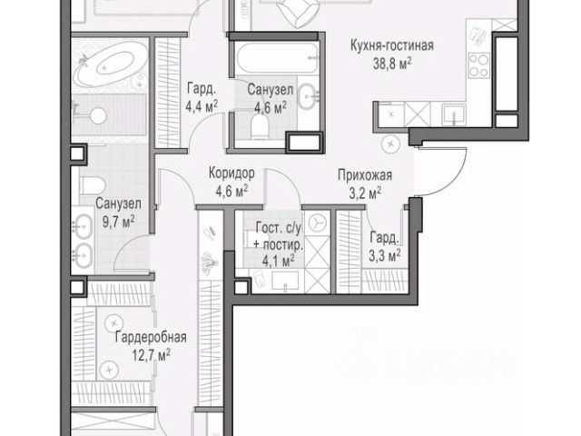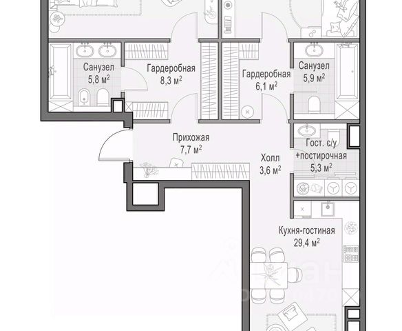 Просторная квартира площадью 151,3 кв. м. Из кухни-гостиной (41,2 кв. м) открывается панорамный вид на красивый двор-парк с ландшафтным дизайном и вечерней подсветкой. Продуманная планировка позволяет разместить три приватные спальни, в одной из которых, примыкающей к мастер-спальне, предусмотрен санузел с окном, что делает ваше личное пространство по-настоящему комфортным. Окна выходят на три стороны. Life Time - роскошный современный квартал на Пресне, в наиболее быстро растущем премиальном районе ЦАО. Его насыщенная инфраструктура и выгодное расположение дарят время для жизни. Вы больше не тратите его на дорогу или ожидание, при этом ни в чём себе не отказывая. На территории предусмотрено всё для комфортной жизни: • двор-парк площадью 1,8 гектара с прудом и фонтанами; • Clubhouse - инфраструктурный центр в отдельном здании с исчерпывающими возможностями для спорта, отдыха и досуга только для жителей; • спортивная инфраструктура на улице и в помещении, в том числе бассейн длиной 25 метров, хот-таб, хаммам, сауна, бьюти-зона; • клубная гостиная с террасой; • всё для развития и досуга детей любого возраста, в том числе детский сад и школа. Life Time находится в центре сложившегося премиального района, в окружении многочисленных парков. Удобная транспортная доступность и прямой выезд на Звенигородское шоссе позволяют без проблем добраться до Садового кольца и Москва-Сити. Архитектурный стиль квартала - роскошный минимализм. Дома десятилетиями будут выглядеть современно.