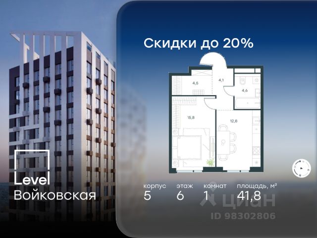 Цена указана с учётом скидки при 100%-й оплате, несубсидированной ипотеке, рассрочке (кроме программы "Рассрочка 0%"). Продается 1-комнатная квартира площадью 41.80 кв. м без отделки. Квартира находится на 6 этаже 20-этажного корпуса 5, в новом жилом комплексе бизнес-класса Level Войковская, расположенном рядом с живописным заповедником "Покровское-Стрешнево" (застройщик - компания Level Group/Левел групп). Прекрасная транспортная доступность - 7 мин. пешком до станции МЦК "Балтийская"; - 15 мин. пешком до станции метро "Войковская"; - 8 мин. на машине до ТТК; - 15 мин. на машине до центра Москвы; - 20 мин. на машине до Москва-Сити. Продуманный архитектурный проект - стильная архитектура от мастерской Фефелова В. В.; - панорамные виды на парки, Химкинское водохранилище и Останкинскую башню; - лобби с высотой потолков до 6,45 метров; - более 20 видов планировочных решений, включая редкие форматы квартир с террасой и увеличенной высотой потолков до 5,42 метров; - 2 варианта дизайнерской отделки в корпусе 4, предлагаются как дополнительная опция к отделке white box: стиль Modern в светлых холодных тонах и стиль Classic в нейтральной бежевой гамме. Квартиры в корпусах 3 и 5 сдаются без отделки. Расположение Level Войковская строится в престижном Северном округе Москвы. Развитая инфраструктура и живописная природа переплетаются в единый ансамбль, столь значимый для комфортной жизни. Войковский район окружают парки и набережные. В шаговой доступности - парк "Покровское-Стрешнево", не более 15-ти минут на велосипеде занимает путь до Тимирязевского парка и 9-ти минут до парка усадьбы Михалково. Рядом более 60 школ, 75 дошкольных учреждений, 17 государственных и 6 частных вузов, 25 супермаркетов, 4 торговых центра, среди которых ТЦ "Метрополис" и ТЦ "Авиапарк". Внутренняя инфраструктура На территории жилого комплекса предусмотрены коммерческие помещения: кафе, ресторан, пекарня и другие сервисы откроются на первых этажах корпусов. Для жителей будет доступен отапливаемый подземный паркинг на 244 машино-места с доступом с любого этажа на лифте. На территории паркинга будет расположено 125 кладовых помещений для хранения сезонного инвентаря. Лобби и благоустройство Дизайн лобби Level Войковская создан совместно с бюро BLANK. Это уютные гостиные, где хочется задержаться. Теплая цветовая гамма, ресепшен, зоны ожидания, лапомойки и гостевые санузлы - каждая деталь превращает лобби в комфортное продолжение вашего дома. 1,15 га площади в первых двух этапах строительства отведено под приватный внутренний двор, который спроектирован совместно с бюро "Правда". Детские площадки для всех возрастов, спортивные пространства для йоги, воркаута и петанка, уютные зоны для тихого отдыха или работы. Здесь утро начинается с вдохновения, а вечер наполнен приятными моментами. Лифты Комфортное перемещение внутри жилого комплекса будут обеспечивать надёжные лифты с доступом в паркинг с жилых этажей. В каждом корпусе предусмотрено по 3 грузопассажирских лифта.