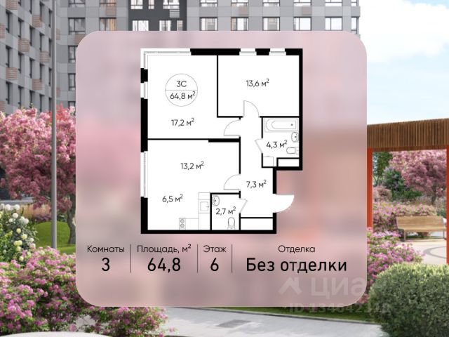 Продается трехкомнатная квартира в городе-парке "Переделкино Ближнее". Общая площадь квартиры - 64,8 кв. м, этаж 6 из 17. Срок сдачи - 1 квартал 2028 года. Тип дома - монолитный. ТОЛЬКО ДО 31 МАРТА выгодные условия на приобретение квартиры в ипотеку или рассрочку. Звоните - и мы подберем оптимальное предложение под ваш запрос! Корпус расположен в 13 фазе строительства и состоит из 8 секций с переменной этажностью 12-17 этажей. Все секции без отделки. Около 13 фазы запланировано строительство многоуровневого паркинга на 300 м/мест. 13 фаза имеет уникальное расположение и находится непосредственно на берегу Федосьинского пруда, который является сердцем города-парка "Переделкино Ближнее". Город-парк "Переделкино Ближнее" расположен в 8 км от МКАД по Боровскому шоссе. ТРАНСПОРТНАЯ ДОСТУПНОСТЬ: - 15 минут пешком до станции МЦД-4 "Мичуринец" - 25 минут пешком до станции метро "Рассказовка" Солнцевской линии - 30 минут до центра Москвы - 2026 г. - открытие трассы Солнцево-Бутово-Варшавское шоссе РАЗВИТАЯ СОЦИАЛЬНАЯ ИНФРАСТРУКТУРА: - 7 детских садов, 3 школы - банки, продуктовые магазины, аптеки, фитнес центры, салоны красоты и пр БЛАГОУСТРОЙСТВО: - дворы без машин - игровые зоны и развивающие детские площадки - зоны для созерцательного и медитативного отдыха - зоны для занятий спортом ОСОБЕННОСТИ АРХИТЕКТУРЫ: - высокие потолки от 3,03 м - безбарьерные входные группы - колясочные в каждой входной группе - кладовые помещения расположены на -1 этаже каждой секции - в каждой секции 2 лифта: 1 пассажирский, 1 грузовой - на фасаде предусмотрены корзины для установки кондиционеров АВТОРСКИЙ ДИЗАЙН: Входные группы выполнены по авторскому дизайну, благодаря панорамному остеклению наполнены естественным светом. В каждой входной группе будет располагаться комфортабельная зона ожидания с возможностью зарядить электронные устройства, почтовые ящики, колясочная, акцентные пуфы и столик.