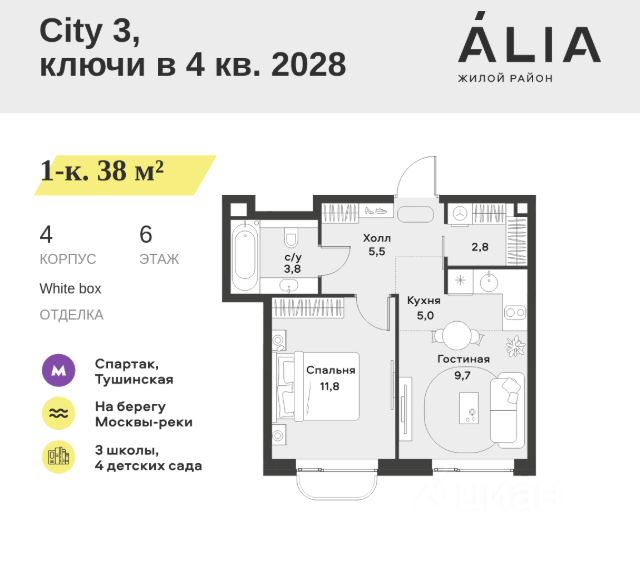 Продаётся 1-комнатная квартира 34.8 м². В жилом районе Алиа на 6-м этаже 18-этажного дома. Жилой район Алиа — это дома бизнес-класса у слияния Москвы-реки и Сходни. Алиа находится в Покровском-Стрешневе, экологически чистом районе на престижном северо-западе столицы. Район возводится на бывшей территории Тушинского аэрополя, где никогда не было промышленного производства. Алиа — это район разностороннего развития, спроектированный по принципу WORK.LIVE.PLAY.LEARN. Это "15-минутный город", где вся необходимая для комфортной жизни инфраструктура — на расстоянии приятной прогулки. У района удобное расположение: отсюда меньше 10 минут пешком до станций метро "Спартак" и "Тушинская" и всего полчаса на автомобиле до центра города или аэропорта Шереметьево. Архитектурную концепцию Алиа разработало бюро SOM (Skidmore, Owings & Merrill), авторы знаменитой "Бурдж-Халифа". В Алиа больше 140 планировочных решений, среди которых — редкие для Москвы форматы: квартиры с окном в ванной, пентхаус, сити-юниты и таунхаусы. Почти половина территории района отдана под благоустройство. В Алиа три парка: Линейный парк с кафе и магазинами, Центральный парк с амфитеатром, сухим фонтаном и большим плейхабом для детей всех возрастов и Прибрежный парк на собственной набережной, одной из самых длинных в Москве. В каждом урбан-блоке — закрытый внутренний двор с гипоаллергенными растениями и детской площадкой. В лобби каждого жилого корпуса в Алиа оборудована зона ожидания, колясочная, гостевой санузел и лапомойка для домашних животных. За стойкой ресепшена резидентов и их гостей встречает консьерж. Центральное лобби урбан-блока — это стильное общественное пространство с коворкингом, лаундж-зоной и кофе-пойнтом. Это "вторая гостиная" жителей урбан-блока и одно из мест, где формируется комьюнити Алиа. Два ключевых объекта инфраструктуры в Алиа — это спорткомплекс "Чкалов Арена", где представлены 25 видов спорта, и самый большой в стране бизнес-парк класса A, благодаря которому району обеспечено быстрое развитие.