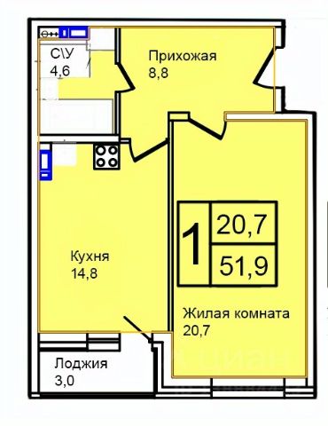 Продаётся 1-комнатная квартира в строящемся доме (Корпус 1), срок сдачи: IV-кв. 2027, общей площадью 51.9 кв.м., на 6 этаже.