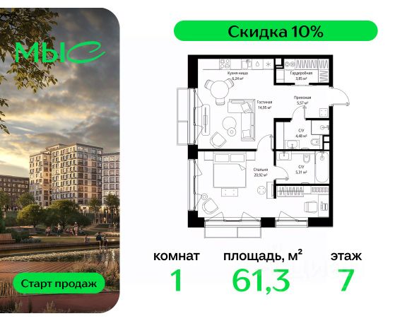 Прямая продажа от застройщика. Продаётся 2-комнатная квартира общей площадью 77.85 м² без отделки в премиальном жилом комплексе "МЫС" на 7-м этаже 12 этажного дома. Квартира расположена в корпусе "Волга". Проект МЫС — это, прежде всего, идеальное место для семей. В рамках проекта построят государственную школу, два детских сада и дворец спорта площадью 20 000 м2 с термальным комплексом, выплывным бассейном, фитнес-залом, теннисными, сквош и падел кортами и секциями для детей. На территории площадью, сравнимой с тремя парками Зарядье, появятся кафе и рестораны, пруд с набережной, спортивные и детские площадки, скейт-парк, лыжные и веломаршруты. Расположение: - 2 минуты до скоростной трассы М1 и Минского шоссе; - 10 минут до МКАД; - 15 минут до МЦД Лесной Городок - 20 минут до делового центра "Москва-Сити"; - 28 минут до аэропорта "Внуково". Благоустройство: - велосипедные и лыжные маршруты; - собственная набережная и парк; - лаунж-зоны в окружении природы; - беседки у очага; - дворец спорта площадью 20 000 м²; - термальный комплекс с тремя бассейнами; - 4 теннисных и падел-корта; - 6 сквош-кортов; - многофункциональный спортзал; - скейт-парк; - просторная площадь для прогулок с фонтаном; - детский клуб с творческими секциями; - гастро-доминанта; - кафе у пруда, рестораны, ритейл. Окружение - соседство с лесным фондом; - школа на 1250 мест и 2 детских сада на 350 и 255 мест; - Дубковский и Подушкинский леса, парк "Рассказовка", Мещерский парк. Действуют специальные условия при 100% оплате, подробности уточняйте у менеджера в офисе продаж.