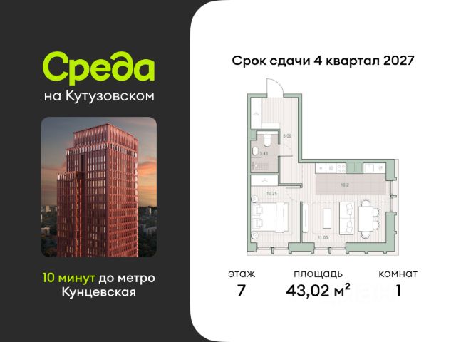 О квартире Продаётся двухкомнатная квартира общей площадью 57.87 кв. м. с отделкой на выбор: черновая, White Box. Квартира на 7 этаже корпуса 4.1 в жилом комплексе бизнес-класса "Среда на Кутузовском". До метро "Кунцевская" 10 минут пешком. Исторический зелёный район "Среда на Кутузовском" строится в Кунцево - историческом и экологически чистом районе Москвы. Здесь нет крупных производств, много лесных массивов и роза ветров, которая обеспечивает приток чистого воздуха. Район наполнен жизнью и уже развит: много детских садов и школ, поликлиники, магазины, кафе, спортивные объекты, парки. - 10 минут пешком до станции метро "Кунцевская". - 5-8 минут на машине до Кутузовского проспекта и Можайского шоссе и 10-15 минут до Рублёвского и МКАД. - 15 минут езды до Крылатских холмов, Суворовского парка и заказника "Долина реки Сетунь". Акции и спецпредложения - Выгода 12%: если внести 100% оплату или оформить семейную ипотеку под 6%. Действует до 13 апреля. - Низкие ставки по ипотеке: 0,1% в первый год или 0,11% в первые два года кредита. - Трейд-ин от "Среды": можно обменять свою текущую квартиру на новую. - Ипотека для семей с детьми: если ребёнку до 7 лет, предлагаем льготную ставку 3,5% О жилом комплексе "Среда на Кутузовском" - новый квартал с башнями от 12 до 44 этажей, окружённый лесными массивами и историческими усадьбами старой Москвы. Во внутреннем дворе есть водоём, многоуровневые зоны с детскими и спортивными площадками, коворкинг на свежем воздухе и локации для уединённого отдыха. Особенности - Архитектура с многослойными фасадами. - Квартиры с террасами и мастер-спальнями. - Окна в пол на всех этажах. - Общественные лаунж-гостиные. - Собственный ландшафтный парк во дворе. - Зоны барбекю и площадки для отдыха у воды. - Умный подземный паркинг. - Стрит-ритейл на первых этажах.
