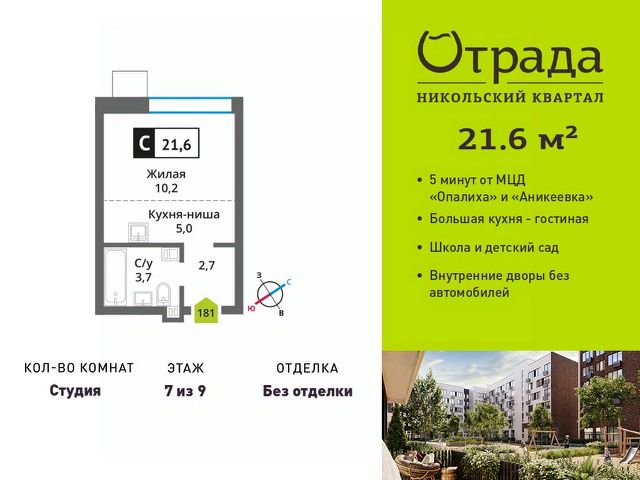 Номер в базе: 9937618. Продаётся отличная СТУДИЯ в ЖК Комфорт-класса "Никольский квартал Отрада" общей площадью 21, 8 кв. м. Один из лучших районов ближнего Подмосковья Красногорск. 12 КОРПУС. ДОМ СДАН! ВЫДАЧА КЛЮЧЕЙ! О КВАРТИРЕ: - студия общей площадью 21, 8 кв. м. - этаж 7/9 - корпус 12 / секция 2 - удобная современная планировка - без отделки ОКРУЖЕНИЕ: Проектом предусмотрены 14 корпусов средней этажности — 6-9 этажей, а также муниципальная школа, один муниципальный и один частный детский сад, два наземных многоуровневых паркинга с кладовыми помещениями. Современная европейская архитектура с элементами скандинавского стиля создает ощущение жизни в спокойном и безопасном благополучном районе. Отдельное преимущество — естественная закрытость проекта. Территория не огорожена, но изолирована за счет естественного барьера — окружающего квартал лесного массива. Такое расположение создает ощущение безопасного загородного пригорода. Кроме того, лес помогает создать особый микроклимат, защищая от городского смога, шума и ветров. ТРАНСПОРТНАЯ ДОСТУПНОСТЬ: - квартал расположен в удачной локации, которая сочетает благоприятную экологическую обстановку с прекрасной транспортной доступностью - до МЦД "Опалиха" и "Аникеевка" можно будет добраться наземным транспортом всего за 4-5 минут, до центра Красногорска за 10 минут - в рамках проекта строится автодорога, которая позволит напрямую попасть на эстакаду к МЦД Аникеевка О ДОМЕ: - дом монолитный - облицовка кирпичом нескольких оттенков - дворы без машин - безбарьерная среда для свободного передвижения - первые этажи зданий будут отданы под коммерческую инфраструктуру - благоустроенные зеленые дворы и пешеходный бульвар создадут атмосферу уюта и комфорта О ДОКУМЕНТАХ: - один взрослый собственник - без обременений ЮРИДИЧЕСКАЯ ЧИСТОТА СДЕЛКИ: Покупая квартиру через агентство недвижимости "Этажи", Вы получаете: - юридически чистую квартиру без рисков, консультирование, безопасный расчет - помощь в одобрении и оформлении ипотеки во всех ведущих банках с преференциями от 0, 3% - экономия ежегодных страховых взносов на 20-30% - сертификат финансовой безопасности _________________________________________________ _______ Звоните! Отвечу на все Ваши вопросы! Если Вы планируете продажу своей квартиры, обращайтесь я готова помочь! Код пользователя: 142031