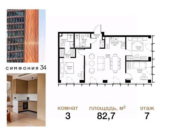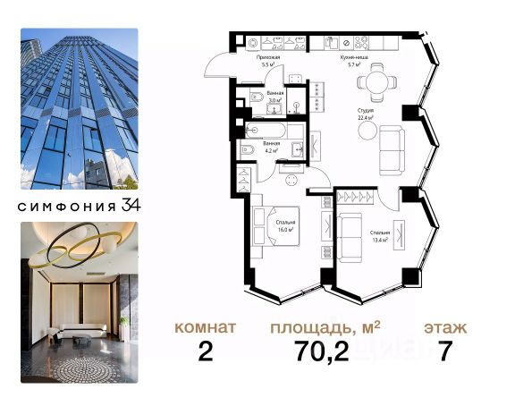 Дом сдан. Ключи в день покупки! В продаже 2-комнатная квартира площадью 70.20 м² с предчистовой отделкой на 7 этаже 49 этажного дома в корпусе Кристал. ЖК Симфония 34 - концептуально новый жилой комплекс премиум-класса с подземной парковкой, состоит из четырех башен высотой 36 - 54 этажа. Квартиры сдаются с базовой (предчистовой) отделкой MR BASE или дизайнерской чистовой отделкой MR READY. Высота потолков 3 - 6 метров, окна высотой до 2,6 м. Более 100 кладовых в подземной части ЖК и более 500 на этажах. Безопасность - Система контроля входа на территорию комплекса, биометрия - Система автоматического водяного пожаротушения и противопожарного водопровода, система пожарной вентиляции - Доступ на парковку при помощи системы распознавания автомобильных номеров, карточка для контроля доступа резидентов - Система видеонаблюдения - Круглосуточная связь через приложение, телефон, голосовые сообщения с охраной, консьержем, call-центр. Расположение Пешком - 6 минут до метро "Дмитровская" - 15 минут до Тимирязевского парка На машине - 5 минут до Савеловского вокзала и Аэроэкспресса в Шереметьево - 10 минут до Москва-Сити и Садового кольца Благоустройство - 70% территории отведены под зеленые насаждения и ландшафтный дизайн - Приватный Японский сад - Детские площадки с зонированием по возрасту - Clubhouse для резидентов - Wellness & SPA - Зона для пикника, зона с гамаками - Центральное лобби, ресторан, коммерческие помещения - Дополнительный вход/выход на территорию комплекса Окружение - В 10 минутах от Symphony 34 находится дизайн-завод Flacon, где регулярно проходят культурно-образовательные и развлекательные мероприятия - Тимирязевский парк расположен в 850 м. Площадь парка 232 га - Рядом расположен парк "Дубки", площадью 16,5 га. - В 15 минутах расположен Хлебозавод 9. Здесь находятся шоурумы брендов, кафе разных кухонь мира, образовательные проекты и площадки для мероприятий Компания MR предлагает своим клиентам специальные условия приобретения квартир в рамках программ ипотечного кредитования от банков-партнеров.