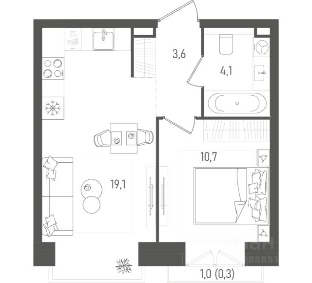 Из мебели в квартире остаются: качественный кухонный гарнитур с каменной столешницей и бытовой техникой, встроенный шкаф в коридоре.