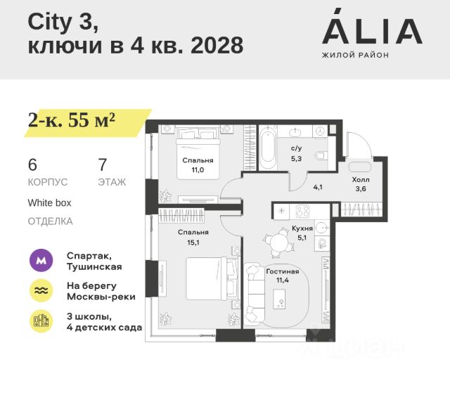 Продаётся 2-комнатная квартира 53 м². В жилом районе ALIA на 7-м этаже 28-этажного дома. Жилой район ALIA — это дома бизнес-класса у слияния Москвы-реки и Сходни. ALIA находится в Покровском-Стрешневе, экологически чистом районе на престижном северо-западе столицы. Район возводится на бывшей территории Тушинского аэрополя, где никогда не было промышленного производства. ALIA — это район разностороннего развития, спроектированный по принципу WORK.LIVE.PLAY.LEARN. Это "15-минутный город", где вся необходимая для комфортной жизни инфраструктура — на расстоянии приятной прогулки. У района удобное расположение: отсюда меньше 10 минут пешком до станций метро "Спартак" и "Тушинская" и всего полчаса на автомобиле до центра города или аэропорта Шереметьево. Архитектурную концепцию ALIA разработало бюро SOM (Skidmore, Owings & Merrill), авторы знаменитой "Бурдж-Халифа". В ALIA больше 140 планировочных решений, среди которых — редкие для Москвы форматы: квартиры с окном в ванной, пентхаус, сити-юниты и таунхаусы. Почти половина территории района отдана под благоустройство. В ALIA три парка: Линейный парк с кафе и магазинами, Центральный парк с амфитеатром, сухим фонтаном и большим плейхабом для детей всех возрастов и Прибрежный парк на собственной набережной, одной из самых длинных в Москве. В каждом урбан-блоке — закрытый внутренний двор с гипоаллергенными растениями и детской площадкой. В лобби каждого жилого корпуса в ALIA оборудована зона ожидания, колясочная, гостевой санузел и лапомойка для домашних животных. За стойкой ресепшена резидентов и их гостей встречает консьерж. Центральное лобби урбан-блока — это стильное общественное пространство с коворкингом, лаундж-зоной и кофе-пойнтом. Это "вторая гостиная" жителей урбан-блока и одно из мест, где формируется комьюнити ALIA. Два ключевых объекта инфраструктуры в ALIA — это спорткомплекс "Чкалов Арена", где представлены 25 видов спорта, и самый большой в стране бизнес-парк класса A, благодаря которому району обеспечено быстрое развитие.