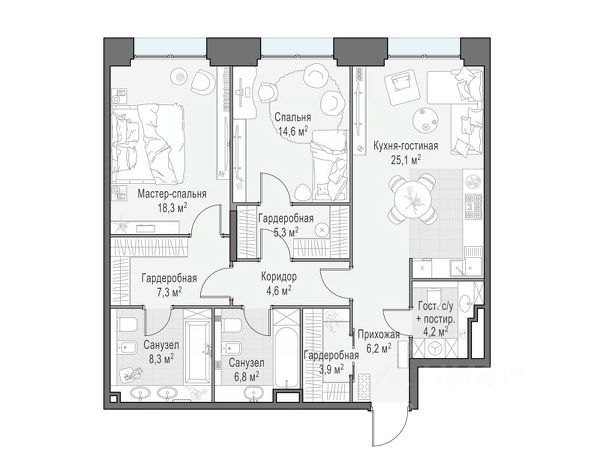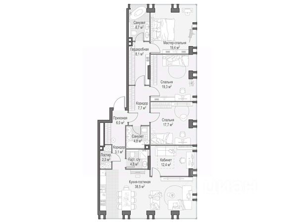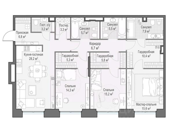 Просторная светлая квартира площадью 134,7 кв. м. Кухня-гостиная обращена окнами в сторону живописного внутреннего двора, а панорамное остекление улучшает видовые характеристики квартиры. Продуманная планировка позволяет разместить три спальни с отдельными гардеробными, а мастер-спальня позволяет разместить отдельный санузел и гардероб. Life Time - роскошный современный квартал на Пресне, в наиболее быстро растущем премиальном районе ЦАО. Его насыщенная инфраструктура и выгодное расположение дарят время для жизни. Вы больше не тратите его на дорогу или ожидание, при этом ни в чём себе не отказывая. На территории предусмотрено всё для комфортной жизни: • двор-парк площадью 1,8 гектара с прудом и фонтанами; • Clubhouse - инфраструктурный центр в отдельном здании с исчерпывающими возможностями для спорта, отдыха и досуга только для жителей; • спортивная инфраструктура на улице и в помещении, в том числе бассейн длиной 25 метров, хот-таб, хаммам, сауна, бьюти-зона; • клубная гостиная с террасой; • всё для развития и досуга детей любого возраста, в том числе детский сад и школа. Life Time находится в центре сложившегося премиального района, в окружении многочисленных парков. Удобная транспортная доступность и прямой выезд на Звенигородское шоссе позволяют без проблем добраться до Садового кольца и Москва-Сити. Архитектурный стиль квартала - роскошный минимализм. Дома десятилетиями будут выглядеть современно.