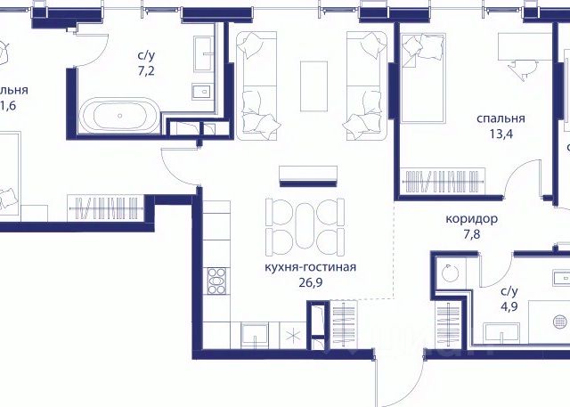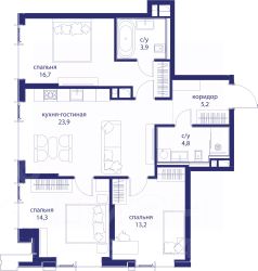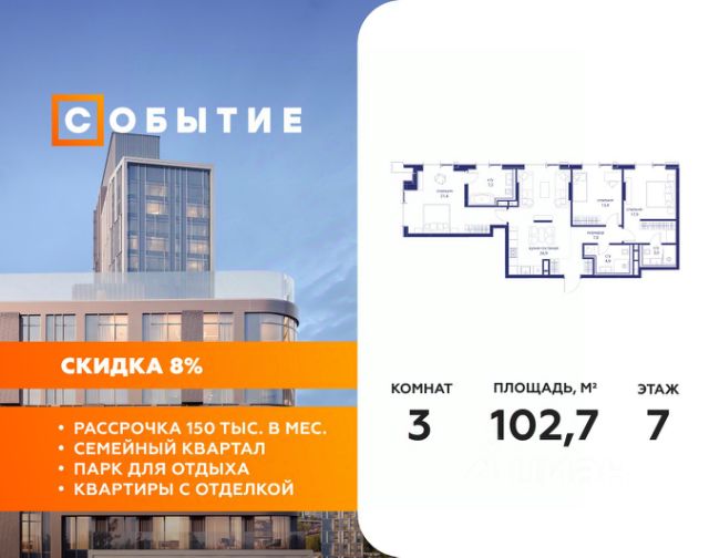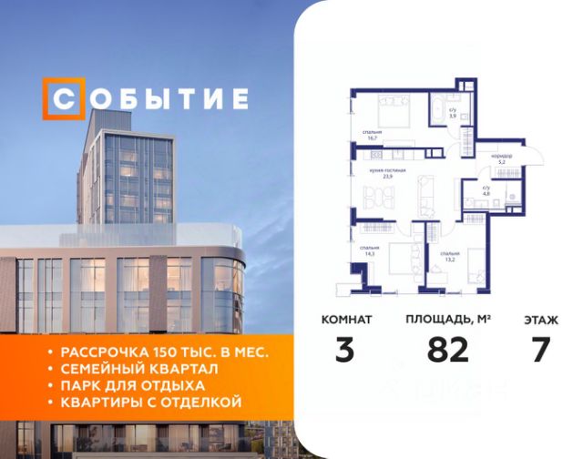 В продаже 3-к квартира от застройщика. Общая площадь 82.00, жилая 44.20, кухня 23.9. Квартира расположена на 7 этаже жилого квартала "Событие-6", корпус 1, Секция 3. Квартира с чистовой отделкой. Срок сдачи: 4 кв. 2029 года. СОБЫТИЕ.6 — финальный дом парк-квартала СОБЫТИЕ на Мосфильмовской. Переезжайте в уже сформированный квартал с готовой инфраструктурой и парком! Премиальный жилой комплекс в престижном районе Москвы предлагает стильную архитектуру, продуманное благоустройство и великолепно разнообразие общественных пространств. Свой парк прямо возле дома! Архитектура Архитектура СОБЫТИЯ.6 выполнена в ультрасовременном стиле московским бюро Atrium на основе дизайн-кода британских архитекторов LDA Design и UHA London. Дом отличает оригинальная геометрия фасадов, большое остекление и высокие лобби (до 6,2 м) с авторской мебелью и светильниками. Расположение Мосфильмовская улица (Раменки) — один из престижных районов Москвы. Близость к историческому и деловому центру, природным зонам Запада столицы. Транспортная доступность: • 10 мин до Москва-Сити и ТТК; • 15 мин до Садового кольца; • 25 мин до аэропорта Внуково; • 7-10 мин до станций метро "Аминьевская" и "Мичуринский проспект". Инфраструктура: • парк "Событие" (12 га, финалист конкурса Правительства Москвы) с беговыми (1,5 км) и велодорожками (2,7 км), экотропой (1,6 км), площадками, лекторием; • школа, детский сад, магазины, салоны красоты, рестораны (к моменту заселения); • мультидвор с игровыми и спортивными площадками, мини-бульваром; • общественная терраса на 10-м этаже (коворкинг, лаунж); • Закрытые общественные пространства: детская комната, спортивный зал, коворкинг, лаунж-зоны. Паркинг 256 мест для жителей (48 — для электромобилей), 24 гостевых (5 — для электромобилей), мойки колес, кладовые, зоны для велосипедов. Окружение Парки и заповедники (Воробьёвы горы, Матвеевский лес и др.), МГУ, театр им. Н. И. Сац, стадион "Лужники". Безопасность Видеонаблюдение, контроль доступа, видеодомофоны, консьерж-сервис 24/7, системы пожарной безопасности и мультисервисная оптическая сеть.