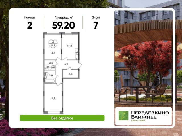 Продается двухкомнатная квартира в городе-парке "Переделкино Ближнее". Общая площадь квартиры - 57,1 кв. м, этаж 7 из 17. Срок сдачи - 1 квартал 2028 года. Тип дома - монолитный. Корпус расположен в новой 13 фазе строительства и состоит из 8 секций с переменной этажностью 12-17 этажей. Все секции без отделки. Около 13 фазы запланировано строительство многоуровневого паркинга на 300 м/мест. 13 фаза имеет уникальное расположение и находится непосредственно на берегу Федосьинского пруда, который является сердцем города-парка "Переделкино Ближнее". Город-парк "Переделкино Ближнее" расположен в 8 км от МКАД по Боровскому шоссе. ТРАНСПОРТНАЯ ДОСТУПНОСТЬ: - 15 минут пешком до станции МЦД-4 "Мичуринец" - 25 минут пешком до станции метро "Рассказовка" Солнцевской линии - 30 минут до центра Москвы - 2026 г. - открытие трассы Солнцево-Бутово-Варшавское шоссе РАЗВИТАЯ СОЦИАЛЬНАЯ ИНФРАСТРУКТУРА: - 7 детских садов, 3 школы - банки, продуктовые магазины, аптеки, фитнес центры, салоны красоты и пр БЛАГОУСТРОЙСТВО: - дворы без машин - игровые зоны и развивающие детские площадки - зоны для созерцательного и медитативного отдыха - зоны для занятий спортом ОСОБЕННОСТИ АРХИТЕКТУРЫ: - высокие потолки от 3,03 м - безбарьерные входные группы - колясочные в каждой входной группе - кладовые помещения расположены на -1 этаже каждой секции - в каждой секции 2 лифта: 1 пассажирский, 1 грузовой - на фасаде предусмотрены корзины для установки кондиционеров АВТОРСКИЙ ДИЗАЙН: Входные группы выполнены по авторскому дизайну, благодаря панорамному остеклению наполнены естественным светом. В каждой входной группе будет располагаться комфортабельная зона ожидания с возможностью зарядить электронные устройства, почтовые ящики, колясочная, акцентные пуфы и столик.