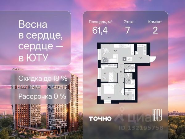 Скидка до 18% в апреле на выделенный пул лотов! ЮТУ — камерный проект бизнес-класса с исключительной архитектурой, видовыми квартирами и подходом к большой благоустроенной набережной канала имени Москвы. Проект создает идеальный баланс жизни в городе. Это приватный оазис, где в любой момент можно сменить обстановку и выбрать любой из тысячи маршрутов к активному отдыху и ярким впечатлениям. Удачное месторасположение: • Первая линия в прибрежной части Химкинского водохранилища • Исключительно тихий и зелёный район Южное Тушино • За 2 минуты можно спуститься к воде, за 10 минут найти зеленые парки и готовую инфраструктуру, за 30 минут доехать до Кремля Концепция проекта: • Две футуристичные башни, соединенные торговой галереей от бюро ATRIUM • 60 неповторяющихся планировок: квартиры с угловым панорамным остеклением, мастер-спальнями и гостиными до 39м², а также просторные квартиры площадью до 128,6 м² Чувство эксклюзивности: • Своя приватная жилая экосистема только для резидентов домов • Лаунж-терраса на крыше • В проекте предусмотрен закрытый двор-парк. Прогрессивные технологии: • 3-х уровневая система безопасности (Face ID, BLE-метки, видеонаблюдение) • Умный паркинг с распознаванием номеров Проект федерального девелопера ТОЧНО, который входит в ТОП-5 девелоперов России по объемам строительства.