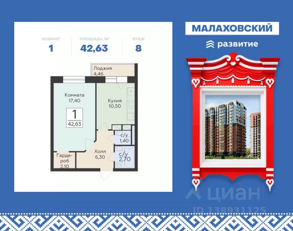 Продается 1-к квартира площадью 42.23 кв. м с черновой отделкой. Квартира расположена на 8 этаже 19 этажного дома, в 201 корпусе. "Малаховский" - жилой комплекс в Раменском районе Подмосковья, идеально подходящий для семей с детьми. Проект от федерального застройщика ГК "Развитие" находится в тихом и зеленом микрорайоне Родники и отличается удобной транспортной связью с Москвой и Люберцами. Три дома высотой 17 этажей с видами на озеро и парк, просторные квартиры, приватный двор-патио с ландшафтным дизайном и доступная инфраструктура обеспечат жителям новых квартир все преимущества городской жизни в живописном природном окружении. Транспортная доступность - Удобный выезд на Егорьевское шоссе и строящуюся магистраль МЕТК (Москва - Егорьевск - Тума - Касимов); - 18 км от МКАД; - 5 мин. до МЦД-3 "Удельная"; - 29 мин. до метро "Лермонтовский проспект". Архитектура Дома отличаются высокой тепло- и шумоизоляцией, долговечностью, высоким уровнем энергоэффективности и современным внешним видом. Фасады выполнены в спокойной цветовой гамме. Из окон с широкоформатным остеклением открываются виды на березовую рощу, озеро и зеленые дворы. Логичным продолжением архитектуры становятся просторные входные группы, где продумано всё: витражное остекление, высокие потолки, дизайнерская отделка, два выхода на обе стороны дома, а также современные лифты (грузовой и пассажирский) и колясочные. Планировочные решения Планировки комплекса "Малаховский" функциональны и эргономичны, что упрощает зонирование и расстановку мебели. Квартиры оснащены гардеробными, лоджиями с панорамным остеклением, двумя санузлами (даже в однокомнатных) и просторными прихожими. Высота потолков - 2,7 м. Квартиры сдаются с отделкой white box, которая позволит воплотить индивидуальный дизайн-проект по своему вкусу. Доступны варианты отделки "под ключ" с применением лучших дизайнерских материалов. Благоустройство В жилом комплексе тщательно продумана концепция благоустройства. Через всю территорию тянутся живописные прогулочные бульвары с ландшафтным дизайном и всесезонным озеленением. Рядом обустроено 3 современных детских площадки с мягким покрытием, а для взрослых предусмотрены уютные лаунж-зоны для общения, тихого отдыха и спорта на свежем воздухе. Двор каждого дома свободен от машин, а для дополнительного уюта и безопасности здесь установлено современное освещение. Естественным продолжением дворового ландшафта становится березовая роща с природными тропинками и небольшим водоемом, прилегающая к жилому комплексу. Инфраструктура и окружение - Наземный паркинг на 55 машино-мест и гостевая парковка; - Все повседневные сервисы (кафе, магазины, салоны красоты) прямо в вашем доме; - Фитнес-клуб, бассейн, спортивные площадки и велодорожки в многочисленных парках микрорайона Родники; - 2 школы, гимназия и детский сад в шаговой доступности; - ТЦ "Родники" с рестораном и супермаркетом; - Петропавловский парк с благоустроенным детским городком и волейбольной площадко