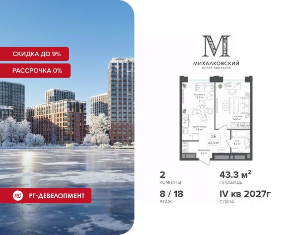 Новогодняя скидка 9% при покупке квартиры! Продаётся 3-к квартира 71,1 кв.м. в ЖК "Михалковский" на 8-м этаже 20 этажного дома. Компания "РГ-Девелопмент" предоставляет новогоднюю скидку на квартиры в жилом комплексе. Акция действительна с 12.09.2024 по 15.01.2026 включительно. Для того чтобы воспользоваться предложением, необходимо подписать договор на приобретение недвижимости до 15.01.2026 включительно. Рассрочка 0% + Скидка 5%. При приобретении дольщиком квартиры в любом из двух данных корпусов с использованием способа оплаты "Рассрочка 0%", у покупателя также есть право воспользоваться скидкой в размере 5% от полной стоимости квартиры. Условия программы рассрочки: Первый платеж составляет 20% от стоимости объекта и вносится при заключении ДДУ. Второй платеж в размере 20% от стоимости объекта вносится по истечении 12 месяцев со дня подписания ДДУ. Оставшаяся сумма, в размере 60%, выплачивается за месяц до планового срока ввода ЖК в эксплуатацию, то есть не позднее 31.05.2027. Действует на приобретение квартир в корп. 2, 7. Действует программа "Растет семья - растет и квартира". Прямая продажа от застройщика! Старт продаж новых корпусов. Квартиры без отделки. Срок сдачи IV кв. 2027г. Особенности проекта: Завораживающие виды Красивое благоустройство Уникальная локация для Москвы (рядом Головинский парк, пруды, усадьба Михалково) Рядом с центром В проекте присутствует: архитектура голландского бюро MLA+, зеленые зоны, транспортная доступность, благоустроенная территория, подземный паркинг, детский сад и выход на Головинский парк с пятью прудами. Название комплекса указывает на одну из его черт - соседство с имением Михалково. Позвольте себе жить в месте, где проводили свой досуг династии Дашковых и Паниных.