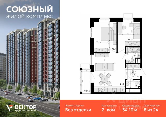 Продается 2-комн. квартира площадью 54,1 кв.м на 8 этаже 24 этажного дома в ЖК "Союзный" от федерального девелопера ГК "Вектор". Расположение, транспортная доступность Жилой комплекс "Союзный" — это квартал из 6 монолитных домов комфорт-класса высотой до 25 этажей, строящийся в 8-ом микрорайоне города Одинцово на улице Маковского. В продаже квартиры площадью от 37,2 до 88 кв. м, с потолками высотой 2,7 м, лоджиями, 2-мя санузлами в квартирах с 3-мя комнатами. Квартиры без отделки и с отделкой эконом, бизнес или комфорт класса. Квартал располагается на территории с отличной транспортной доступностью: - 8 км от МКАД; - 15 минут пешком до станции "Одинцово" МЦД-1; - рядом находится автобусная остановка, от которой можно доехать до метро "Парк Победы", "Киевская", "Юго-Западная"; На личном автотранспорте доехать от комплекса по Минскому шоссе к новой развязке с МКАД можно примерно за 20 минут. В качестве альтернативы можно выбрать Можайское шоссе. Даже в час пик передвигаться по нему можно со скоростью 50 км/ч. Кроме того, можно выбрать платную трассу Северный обход Одинцово. Путь от квартала до Северо-Западной хорды на автомобиле займет 25-35 минут, а до ТТК и Садового кольца - 1 час. В квартале запланировано строительство торгового центра, детского сада на 245 мест (сдача - 4 кв 2025 г.), многоуровневой открытой стоянки на 257 автомобилей, многоуровневого подземного паркинга, наземно-подземного паркинга с эксплуатируемой кровлей и других объектов. На внутренней территории квартала разместятся детский игровой комплекс с резиновым покрытием, спортплощадка, зоны отдыха для взрослых, деревья, кустарники и газоны. В шаговой доступности от ЖК "Союзный" располагаются школа, детский сад, профучилище, несколько ТЦ, кинотеатр "Юность", Ледовый дворец, сквер Союзный, Глазынинский пруд с качелями и площадкой для хоккея. В районе ЖК нет промышленных производств, а совсем близко начинаются лесные массивы, занимающие площадь свыше 70 000 га. Этот район считается одним из самых экологически чистых в Подмосковье.*