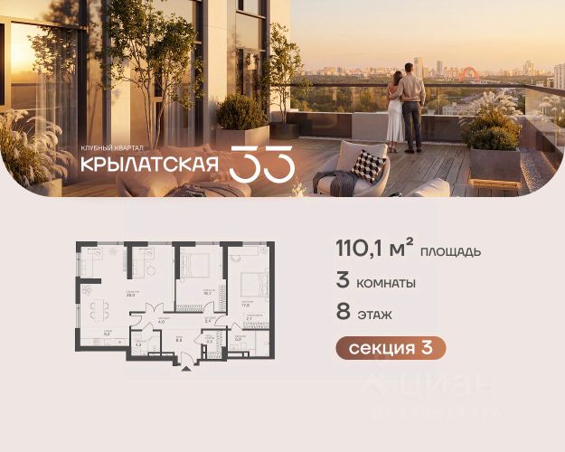 Продается 2-к квартира площадью 79.5 кв.м. на 8-м этаже в ЖК "Клубный квартал Крылатская 33". Прямая продажа от застройщика! Крылатская 33 - проект премиум-класса на западе Москвы от специализированного застройщика "Сияние". Комплекс расположен всего в 15 минутах от Садового кольца и Москва-Сити, а рядом есть большое количество зелёных зон: Крылатский и Москворецкий парки, Серебряный бор, Крылатские холмы - это создает идеальный баланс между приватностью и динамичным ритмом мегаполиса. Квартал сочетает высотные башни до 150 метров и камерные малоэтажные корпуса. Витражное остекление "в пол" наполняет квартиры светом и открывает захватывающие панорамы на Москву-реку и знаковые виды столицы. Здесь каждый найдет то, что подходит именно ему - от уютных студий до роскошных пентхаусов и квартир с собственными террасами. Внутренняя среда жилого комплекса продумана до мельчайших деталей, чтобы резиденты могли продуктивно работать и качественно отдыхать, не покидая территорию: • фитнес-центр, включающий в себя СПА-зону; • коворкинг с кофейней и быстрым интернетом; • общественная гостиная для организации клубных мероприятий; • ресторан с панорамным остеклением; • благоустроенный сад с зоной отдыха; • инновационная игровая площадка для детей всех возрастов; • консьерж-сервис 24/7, современные системы видеонаблюдения и пожаротушения; • двухуровневый паркинг и многое другое. Район Крылатское - точка притяжения для тех, кто выбирает активный образ жизни. В непосредственной близости расположены Гребной канал, Олимпийский велотрек, горнолыжный комплекс "Лата Трэк", гольф-клуб и парковые зоны. В проекте действуют привлекательные условия покупки: - выгода до 10% при 100% оплате (действует на ограниченный пул квартир, подробности уточняйте в отделе продаж). - рассрочка от застройщика 0% с первоначальным взносом от 20% на срок до 30.06.2027.