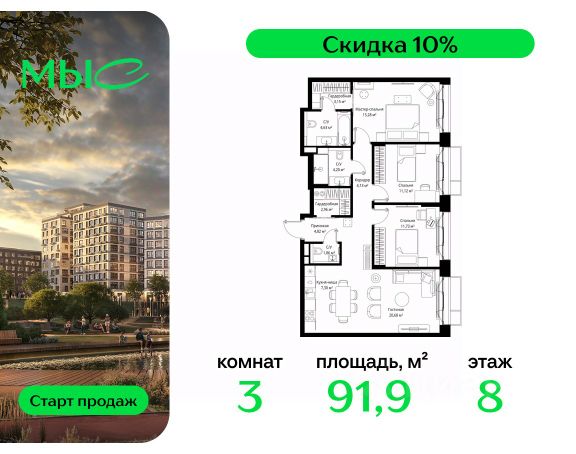 Прямая продажа от застройщика. Продаётся 3-комнатная квартира общей площадью 104.93 м² без отделки в премиальном жилом комплексе "МЫС" на 8-м этаже 12 этажного дома. Квартира расположена в корпусе "Сибирь". Проект МЫС — это, прежде всего, идеальное место для семей. В рамках проекта построят государственную школу, два детских сада и дворец спорта площадью 20 000 м2 с термальным комплексом, выплывным бассейном, фитнес-залом, теннисными, сквош и падел кортами и секциями для детей. На территории площадью, сравнимой с тремя парками Зарядье, появятся кафе и рестораны, пруд с набережной, спортивные и детские площадки, скейт-парк, лыжные и веломаршруты. Расположение: - 2 минуты до скоростной трассы М1 и Минского шоссе; - 10 минут до МКАД; - 15 минут до МЦД Лесной Городок - 20 минут до делового центра "Москва-Сити"; - 28 минут до аэропорта "Внуково". Благоустройство: - велосипедные и лыжные маршруты; - собственная набережная и парк; - лаунж-зоны в окружении природы; - беседки у очага; - дворец спорта площадью 20 000 м²; - термальный комплекс с тремя бассейнами; - 4 теннисных и падел-корта; - 6 сквош-кортов; - многофункциональный спортзал; - скейт-парк; - просторная площадь для прогулок с фонтаном; - детский клуб с творческими секциями; - гастро-доминанта; - кафе у пруда, рестораны, ритейл. Окружение - соседство с лесным фондом; - школа на 1250 мест и 2 детских сада на 350 и 255 мест; - Дубковский и Подушкинский леса, парк "Рассказовка", Мещерский парк. Действуют специальные условия при 100% оплате, подробности уточняйте у менеджера в офисе продаж.