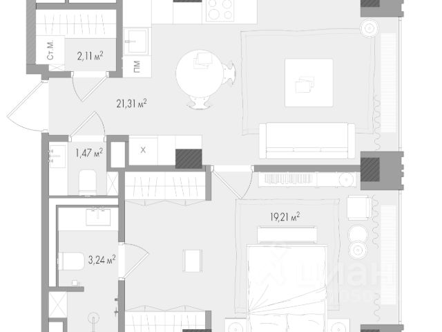 В каждой квартире установлены кухни от итальянского бренда Cesar со встроенной бытовой техникой премиальной линейки Smeg. Кухонный остров, столешница и фартук кухни выполнены из эксклюзивного итальянского мрамора Arabescato Grigio Orobico, одним из лучших видов мрамора на итальянском рынке натуральных отделочных камней.