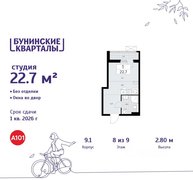 Продается студия 39 в новостройке ЖК "Бунинские кварталы" по адресу Москва, ТиНАО, Новомосковский АО, Сосенское С/П, жилой комплекс Бунинские Кварталы, 9.1, район Коммунарка, Новомосковский административный округ, Москва. Общая площадь квартиры - 22.70 кв. м., этаж 8 из 9, секция 1. Тип проекта, по которому построен дом - монолит, компания-застройщик - ООО "А101". Стоимость квартиры - 10167784 Р. Срок сдачи - 1 квартал 2026. ПРЕДЛОЖЕНИЯ ОТ ЗАСТРОЙЩИКА В ФЕВРАЛЕ 2026: Скидки до 10% на все квартиры. Только в офисах продаж до 28 февраля. Ипотека от 13,9 % для всех! На весь срок. "Семейная ипотека" вернулась. Ставка от 3,5 % на весь срок! Без удорожания! Выгодное ипотечное комбо: Ипотека от 2200 р./мес. и от 6 % после рождения ребёнка! Ипотека для всех "Держи пять!" - ставка 5 % на 2 года! *более подробную информацию по скидкам и акциям уточняйте в отделе продаж ЖК "Бунинские кварталы" строится на юго-западе Москвы. Монолитные дома в лаконичной стилистике гармонируют с живописной природой. Из любой точки района удобно добираться до природных объектов, ключевых транспортных узлов, крупных торговых, спортивных, деловых и медицинских центров. Концепция уникального благоустройства района - "Выходи гулять!". Здесь появятся эстрада для районных творческих мероприятий, спортивные и игровые площадки, скейт-парк, дружелюбные пространства для домашних питомцев, благоустроенная набережная Ивановского пруда. В районе формируется собственная развитая инфраструктура: современные школа на 1100 мест и 2 детских сада на 540 малышей, магазины у дома и сетевые супермаркеты, фитнес, кафе, салоны, детские развивающие центры. Крытый каток "Самолёт Арена" - в 10 минутах пешком. За 15 минут можно дойти до действующей станции метро "Потапово". Предусмотрены удобные автомобильные выезды на проспект Куприна и улицу Александры Монаховой. Особенности "Бунинских кварталов": - ст. метро "Потапово" - 15 минут пешком - своя школа и детские сады - безопасные дворы без машин с системой контроля доступа - насыщенная инфраструктура - в шаговой доступности и на первых этажах домов