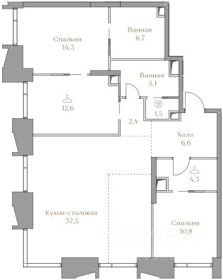 Планировка включает гостиную с био-камином, кухню-столовую, мастер-спальню с собственным санузлом и выходом на балкон, три спальни, четыре санузла, гардеробную, кладовую, два балкона и холл. Из окон открываются виды на спортивный комплекс "Лужники", Новодевичий парк, башни "Москва-Сити" и на благоустроенную территорию комплекса.