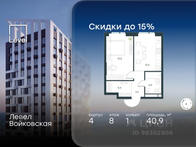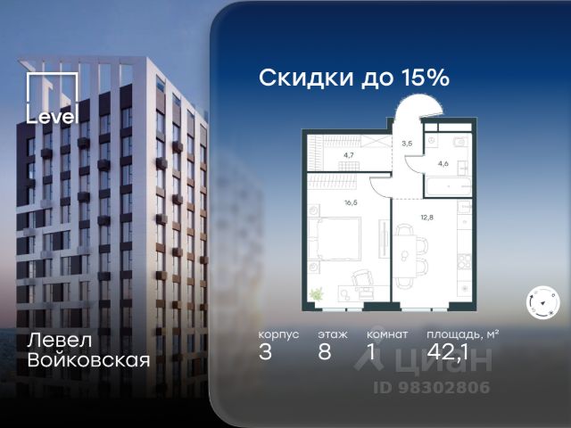 Цена указана с учётом скидки при 100%-й оплате, несубсидированной ипотеке, рассрочке (кроме программы "Рассрочка 0%"). Продается 3-комнатная квартира площадью 91.80 кв. м без отделки. Квартира находится на 8 этаже 20-этажного корпуса 3, в новом жилом комплексе бизнес-класса Левел Войковская, расположенном рядом с живописным заповедником "Покровское-Стрешнево" (застройщик - компания Level Group/Левел групп). Прекрасная транспортная доступность - 7 мин. пешком до станции МЦК "Балтийская"; - 15 мин. пешком до станции метро "Войковская"; - 8 мин. на машине до ТТК; - 15 мин. на машине до центра Москвы; - 20 мин. на машине до Москва-Сити. Продуманный архитектурный проект - стильная архитектура от мастерской Фефелова В. В.; - панорамные виды на парки, Химкинское водохранилище и Останкинскую башню; - лобби с высотой потолков до 6,45 метров; - более 20 видов планировок, включая редкие форматы квартир с террасой и увеличенной высотой потолков до 5,42 метров; - 2 варианта дизайнерской отделки в корпусе 4 как дополнительная опция к отделке white box: стиль Modern в светлых холодных тонах и стиль Classic в нейтральной бежевой гамме. Квартиры в корпусах 3 и 5 сдаются без отделки. Расположение Жилой комплекс Левел Войковская строится в престижном Северном округе Москвы, где развитая инфраструктура и живописная природа переплетаются в единый ансамбль. Войковский район окружают парки и набережные. В шаговой доступности - парк "Покровское-Стрешнево", не более 15-ти минут на велосипеде занимает путь до Тимирязевского парка и 9-ти минут до парка усадьбы Михалково. Рядом более 60 школ, 75 дошкольных учреждений, 17 государственных и 6 частных вузов, 25 супермаркетов, 4 торговых центра, среди которых ТЦ "Метрополис" и ТЦ "Авиапарк". Внутренняя инфраструктура На территории жилого комплекса предусмотрены коммерческие помещения: кафе, ресторан, пекарня и другие сервисы на первых этажах корпусов. Для жителей будет доступен отапливаемый подземный паркинг на 244 машино-места с доступом с любого этажа на лифте. На территории паркинга будет расположено 125 кладовых помещений для хранения сезонного инвентаря. Лобби и благоустройство Дизайн лобби жилого комплекса Левел Войковская создан совместно с бюро BLANK. Теплая цветовая гамма, ресепшен, зоны ожидания, лапомойки и гостевые санузлы - каждая деталь превращает лобби в комфортное продолжение вашего дома. 1,15 га площади в первых двух этапах строительства отведено под приватный внутренний двор, который спроектирован совместно с бюро "Правда". Детские площадки для всех возрастов, спортивные пространства для йоги, воркаута и петанка, уютные зоны для тихого отдыха или работы. Здесь утро начинается с вдохновения, а вечер наполнен приятными моментами. Лифты Комфортное перемещение внутри жилого комплекса обеспечат надёжные лифты с доступом в паркинг с жилых этажей. В каждом корпусе предусмотрено по 3 грузопассажирских лифта.
