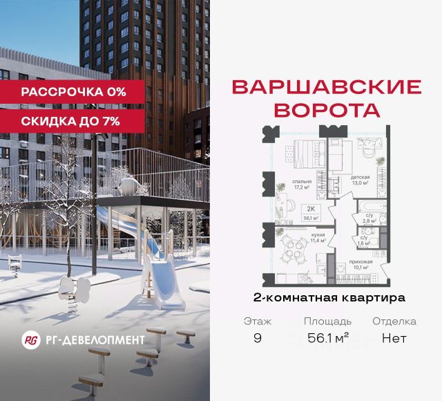 Рассрочка 0% + скидка 5%. Первый платёж 50% при ДДУ, второй 50% — через 12 мес. до ввода ЖК. Продаётся 2-комнатная квартира 56.1 кв.м. в МФК "Варшавские ворота" на 9-м этаже 30 этажного дома. МФК "Варшавские ворота" — это точка баланса между природой и городом, стилем и функциональностью, жизнью сегодня и устойчивым будущим. Коротко о важном: - 1 минута пешком от м. Аннино; - Удобные выезды на Варшавское шоссе и МКАД; - Вид из окон на Битцевский лес и Аннинский лесопарк; - Высота потолков 2,7 - 3 м; - Закрытый двор-парк; - Школы и детские сады в 10-15 минутах пешком от дома; - Технические лоджии для размещения кондиционеров; - Подземный паркинг; - РГ-Девелопмент — ТОП-20 крупнейших застройщиков Москвы. Проект сочетает в себе современную архитектуру и продуманное благоустройство с уникальным природным окружением. Всего в нескольких минутах от дома — девять парков, каскад прудов и крупнейшие лесопарковые зоны Москвы, создающие ощущение жизни в зеленом оазисе посреди мегаполиса. Архитектурная концепция - стиль Чикаго в Москве. Фасады облицованы вентфасадами под клинкерную плитку. Металлические вставки придают динамику, подчёркивая современный характер комплекса. Фасады подчеркивают строгие линии и современный стиль, а входные группы разработаны московским бюро Syntaxis. Лобби оформлены с применением керамогранита, декоративной штукатурки и гипсовых панелей, детали из латуни добавляют изысканности. Проект находится в одной минуте пешком от метро "Аннино", в 12 минутах от станции "Улица Академика Янгеля" и рядом с МЦД-2 "Красный Строитель". Для автомобилистов предусмотрен прямой выезд на Варшавское шоссе и два съезда на МКАД, что позволяет быстро добираться в любую часть города. Среди планировочных решений представлены разнообразные форматы: от функциональных студий до просторных 4-комнатных квартир и апартаментов площадью от 22 до 105 м². Высокие потолки усиливают ощущение простора, а продуманные планировки включают мастер-спальни, гардеробные, угловые окна, объединённые кухни-гостиные и несколько санузлов. Центральное пространство комплекса — закрытый двор без машин. Он разделён на функциональные зоны: детские игровые комплексы, спортивные площадки, воркаут-зоны и уютные места для тихого отдыха. На первых этажах разместятся магазины, кафе и сервисы, что позволит решать повседневные задачи, не покидая территорию комплекса. Для семей с детьми предусмотрен частный детский сад на 50 мест. Подземный паркинг и кладовые обеспечат удобство хранения и безопасность автомобилей. Комплекс окружён девятью парками и лесопарками, каждый из которых обладает своей атмосферой. Выйти на пробежку в Аннинском лесопарке, насладиться прогулками по обширным аллеям в Битцевском лесу, спланировать пикник или велопрогулку в Покровском и Народном парках, любоваться каскадом Кировоградских прудов. Всего в двух станциях — музей-заповедник "Царицыно" с дворцами, фонтанами и живописными пейзажами. Здесь каждый житель найдёт своё любимое мес