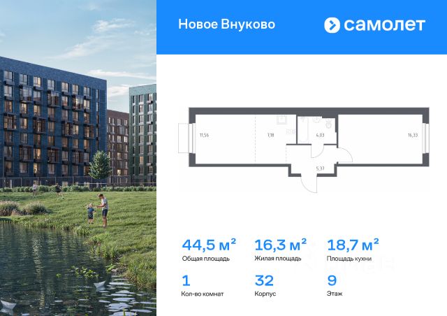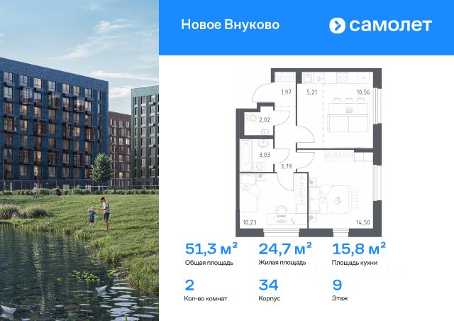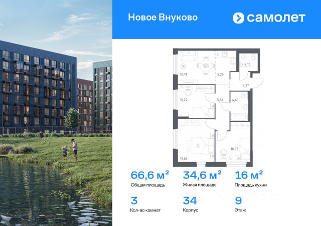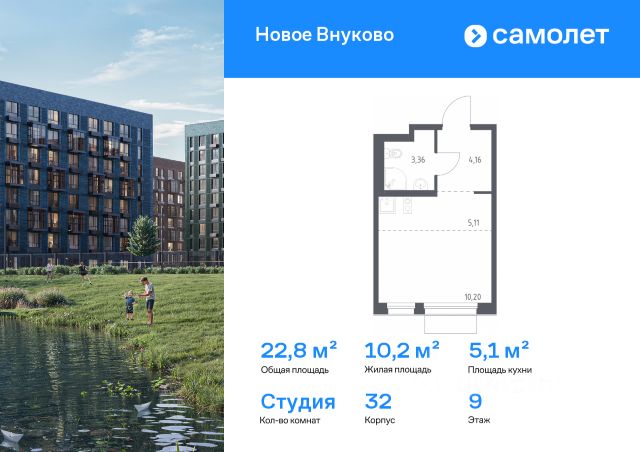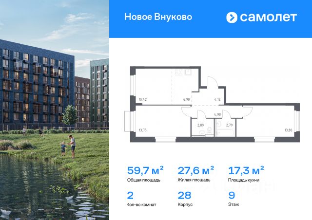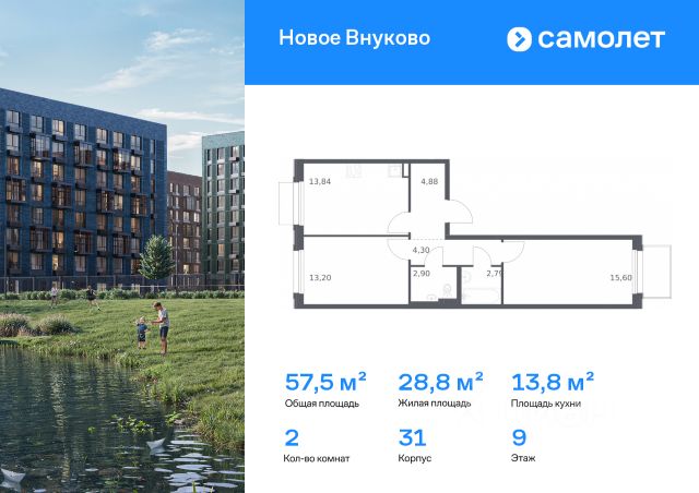 Строим кварталы для жизни с заботой о будущем. Предлагается 2-комнатная квартира комфорт-класса 57,51 кв.м в корпусе 31 на 9 этаже, в ЖК "Новое Внуково" Квартира без отделки. Доступность опции "отделка" и возможность комплектации мебелью и декором уточняйте у застройщика. Приобрести квартиру возможно по специальным акциям от застройщика, с текущими условиями акций можно ознакомиться в блоке "Акций". Цена динамическая и может отличаться, уточняйте актуальность у застройщика. "Новое Внуково" — это жилой комплекс в Новой Москве, у подножия берега реки Незнайка. Поблизости — живописные места для прогулок: народный парк "Ручеек", усадьба Старо-Никольское, Валуевский и Ульяновский лесопарки. Часть домов сдана и внутри района уже открыт детсад с бассейном, а в ближайшее время откроются еще 3 детсада, 2 школы и поликлиника. На территории проекта будет построен первый в России Центр Российской Федерации Баскетбола, где будут площадки с трибунами, тренажерный зал, кафе и конференц-зал. Дворы-парки закрыты от машин и посторонних. На территории — прогулочный маршрут вдоль реки Незнайка и набережная с шезлонгами и качелями для отдыха. Также здесь появится плейхаб "Незнайка на Луне", площадь для мероприятий с сухим фонтаном, летним кинотеатром и кафе. В жилом комплексе — монолитные дома высотой от 6 до 14 этажей. Фасады облицованы кирпичом природных оттенков.