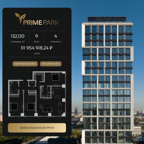 Жилой квартал Prime Park воплощает все преимущества premium-living. Престижная локация на Ленинградском проспекте, 37: - 5 мин. от Тверской улицы, Патриарших прудов и Белой площади, - 20 мин. до аэропорта "Шереметьево" или "Москва-Сити", - 4 парка — Ходынское поле, Петровский и Чапаевский парки, Березовая роща, - 4 станции метро — "ЦСКА", "Аэропорт", "Динамо" и "Петровский парк". Многократный победитель премий European Property Awards и Urban Awards, а также на протяжении пяти лет остается самым продаваемым проектом в своем сегменте. Premium-living Консьержи предугадывают желания резидентов и берут на себя выполнение практически любых бытовых задач. В квартале также есть парк-рейнджер и охрана. Для дополнительного удобства в МОПах предусмотрены почтовые комнаты, колясочные и комнаты для мытья лап домашних питомцев, комната для хранения интернет-заказов. Наличие сервисного входа для персонала позволяет разделить трафик, сохраняя приватную атмосферу в лобби. Резидентам нужно открыть только одну дверь, чтобы оказаться дома: valet-парковщики открывают дверь автомобиля и отвозят его на подземный паркинг, беллмены открывают двери при входе в башню и помогают донести вещи до квартиры, интеллектуальная система обеспечивает бесконтактный вызов лифта. Развитая инфраструктура Близость к центру Москвы, рядом крупнейший ТЦ "Авиапарк", ВТБ Арена, Мегаспорт, ВЭБ Арена, в окружении красивейших парков, включая ультрасовременный Ходынский парк площадью 25 га с панорамными качелями, набережной, фонтанами, детскими и спортивными площадками. На территории квартала предусмотрены приватный фитнес-центр с 25-метровым бассейном и спа, подземный паркинг с кладовыми, местами для хранения велосипедов, электрозарядками и детейлинг-центром для обслуживания автомобилей. На первых этажах башен расположатся кафе и рестораны, цветочный магазин, аптека, салон красоты, премиальный супермаркет и бытовые сервисы. Частный парк Общее парковое пространство квартала — 5,5 га, из них 3 га отведено под частный парк эксклюзивно для резидентов. Большой фонтан, аллеи для прогулок, крупномерные деревья, арт-инсталляции, водные глади, детские площадки и воркаут-зона создают гармоничное сочетание жизни на природе со всеми преимуществами мегаполиса. Уникальная квартирография Более 80 вариантов планировочных решений от однокомнатных квартир до двухуровневых дуплексов и пентхаусов. Панорамные окна, высокие потолки, мастер-спальни, балконы и террасы создают особенный комфорт и уют. Авторская архитектура и дизайн Четыре башни сданы, ключи выдаются в день сделки, 2 башни на этапе строительства, сдача в 2023 и 2024 гг. Уникальный архитектурный ансамбль и ландшафтный дизайн, благородные и ценные материалы в оформлении лобби, предметы искусства, арт-объекты и элементы декора, выполненные на заказ специально для Prime Park, становятся отражением яркой индивидуальности резидентов квартала.